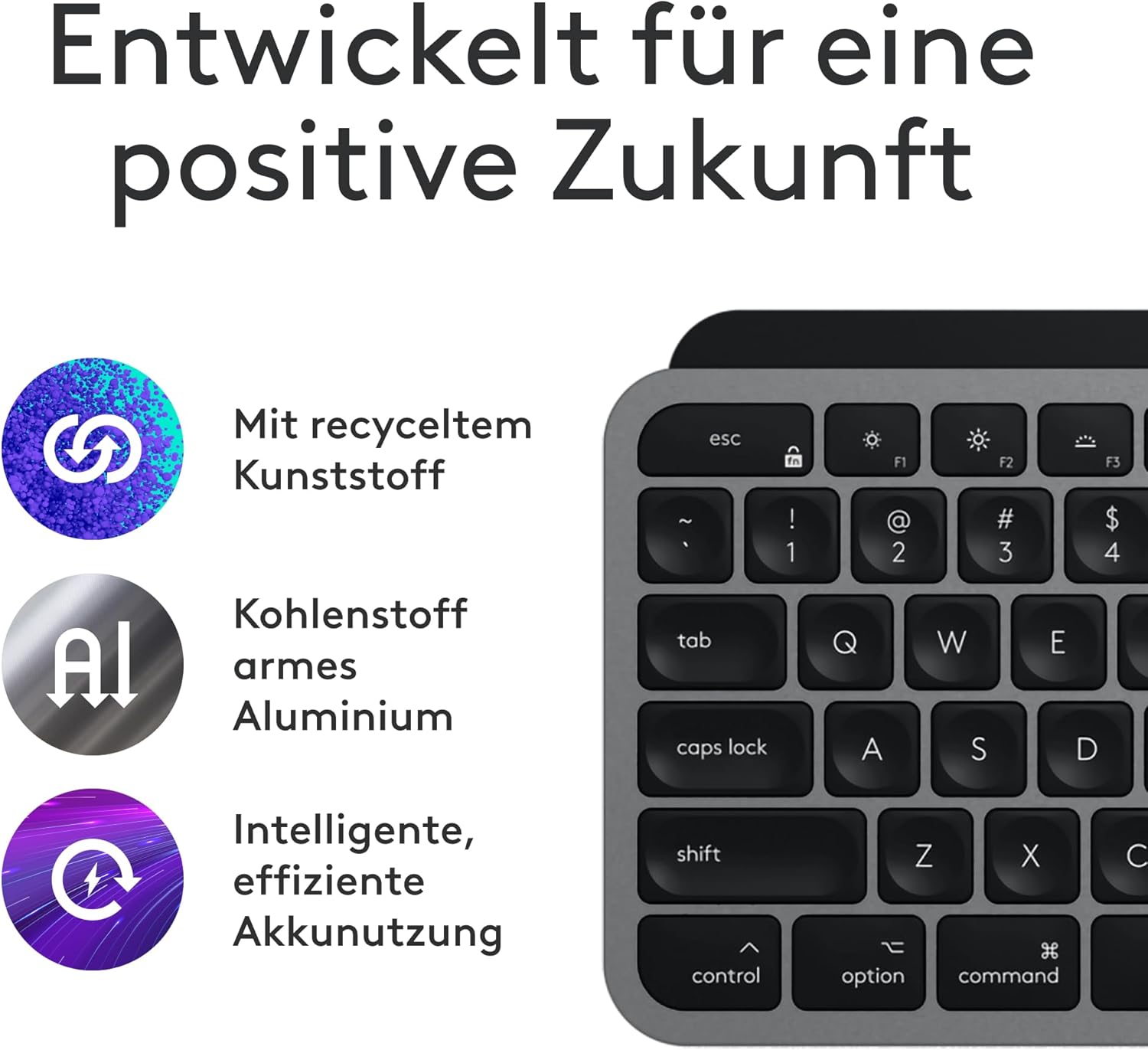 • С рециклирана пластмаса: Пластмасовите части на MX Keys S Combo за Mac са изработени от сертифицирана рециклирана пластмаса; 27% от MX Master 3S за Mac и 26% от MX Keys S за Mac (8)
