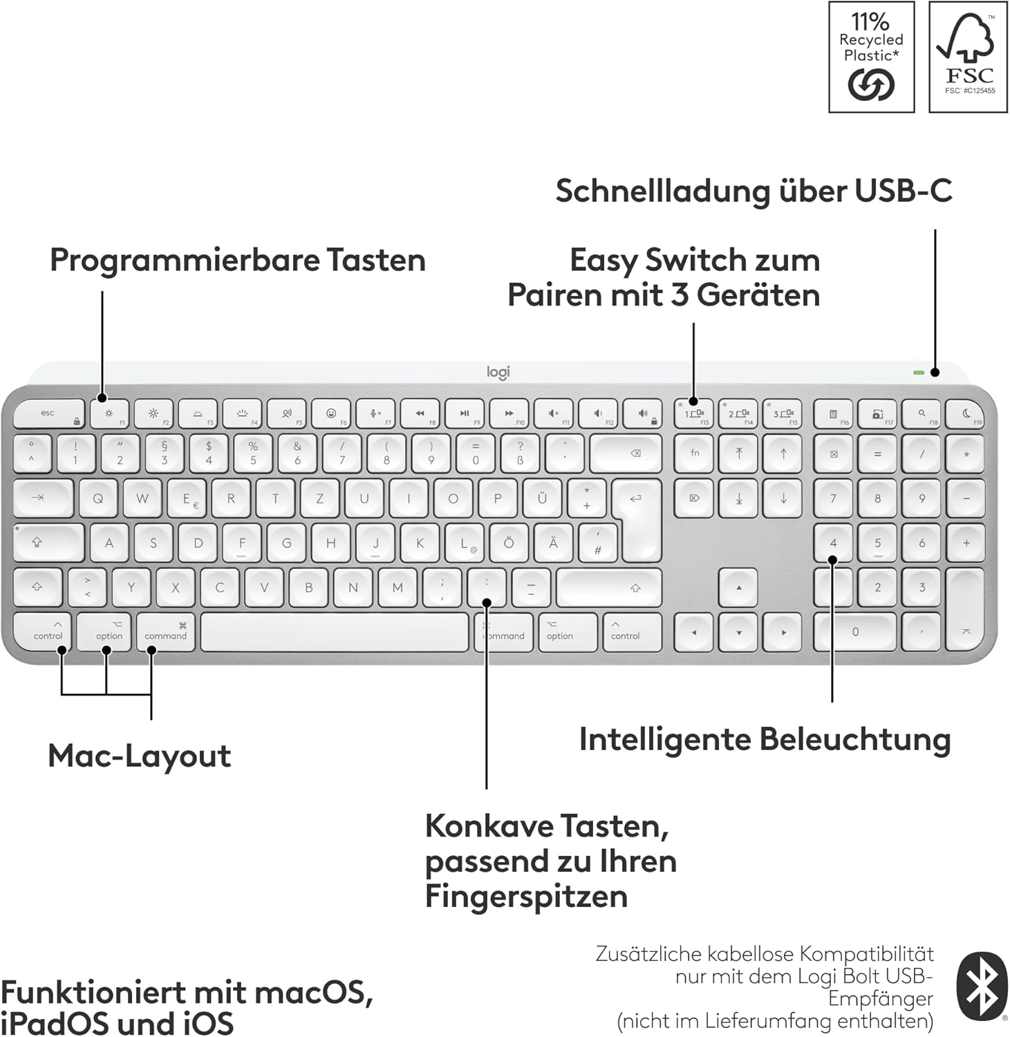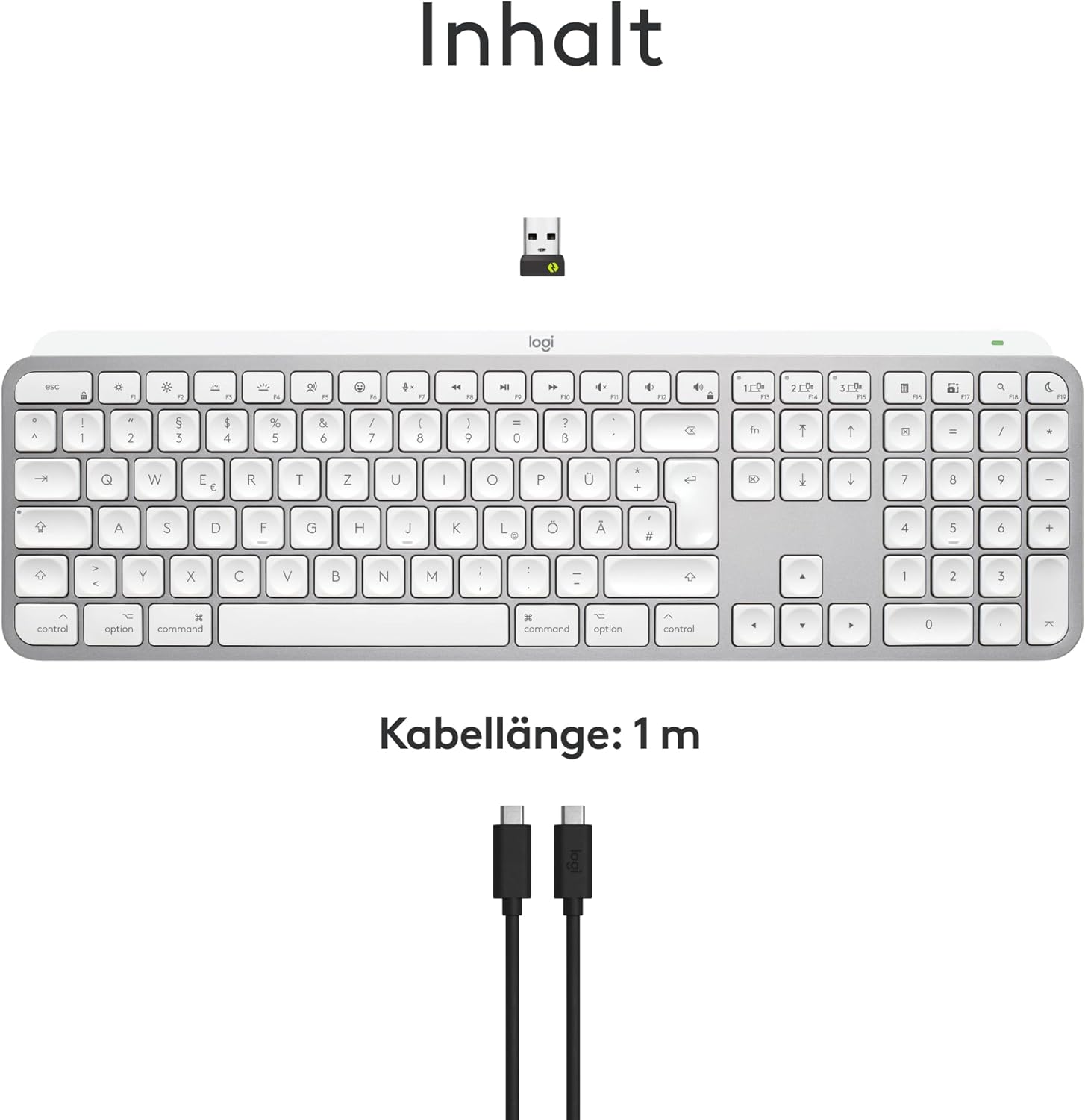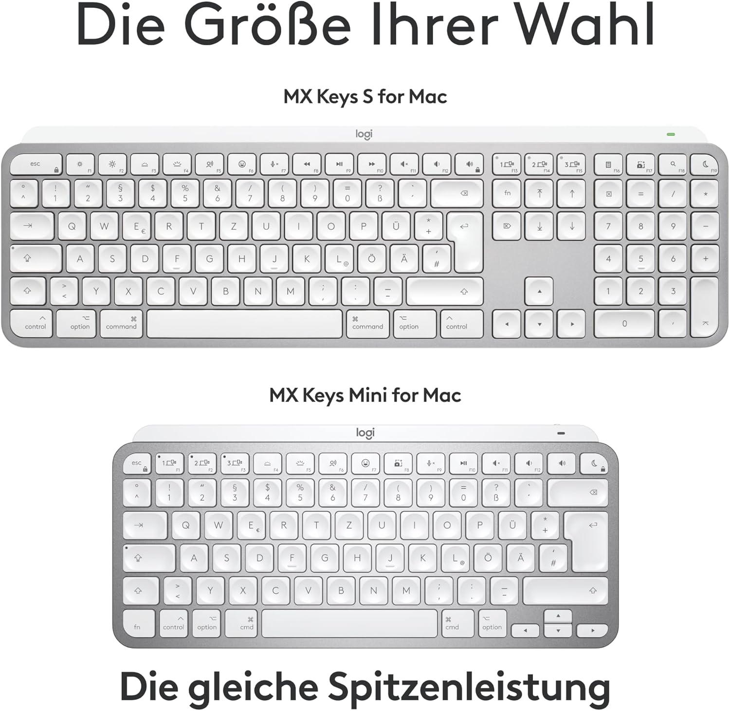 Logitech MX Keys S за Mac, Безжична клавиатура, Флуидна, Прецизно писане, Програмируеми клавиши, Осветени, Bluetooth, USB C, Презареждаема за MacBook Pro/MacBook Air/iMac/iPad, QWERTZ DE - Светло сива