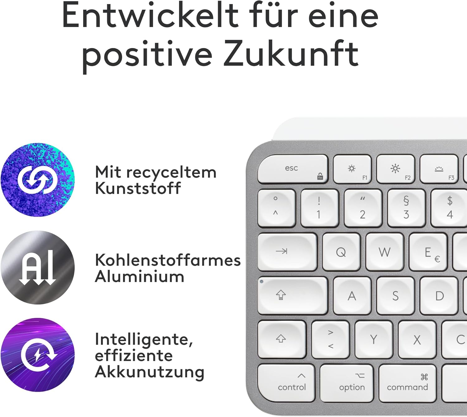 • Изработена от рециклирана пластмаса. Пластмасовите части на MX Keys Mini за Mac са частично изработени от сертифицирана рециклирана пластмаса (светло сиво: 12% и космическо сиво 30%(5)).