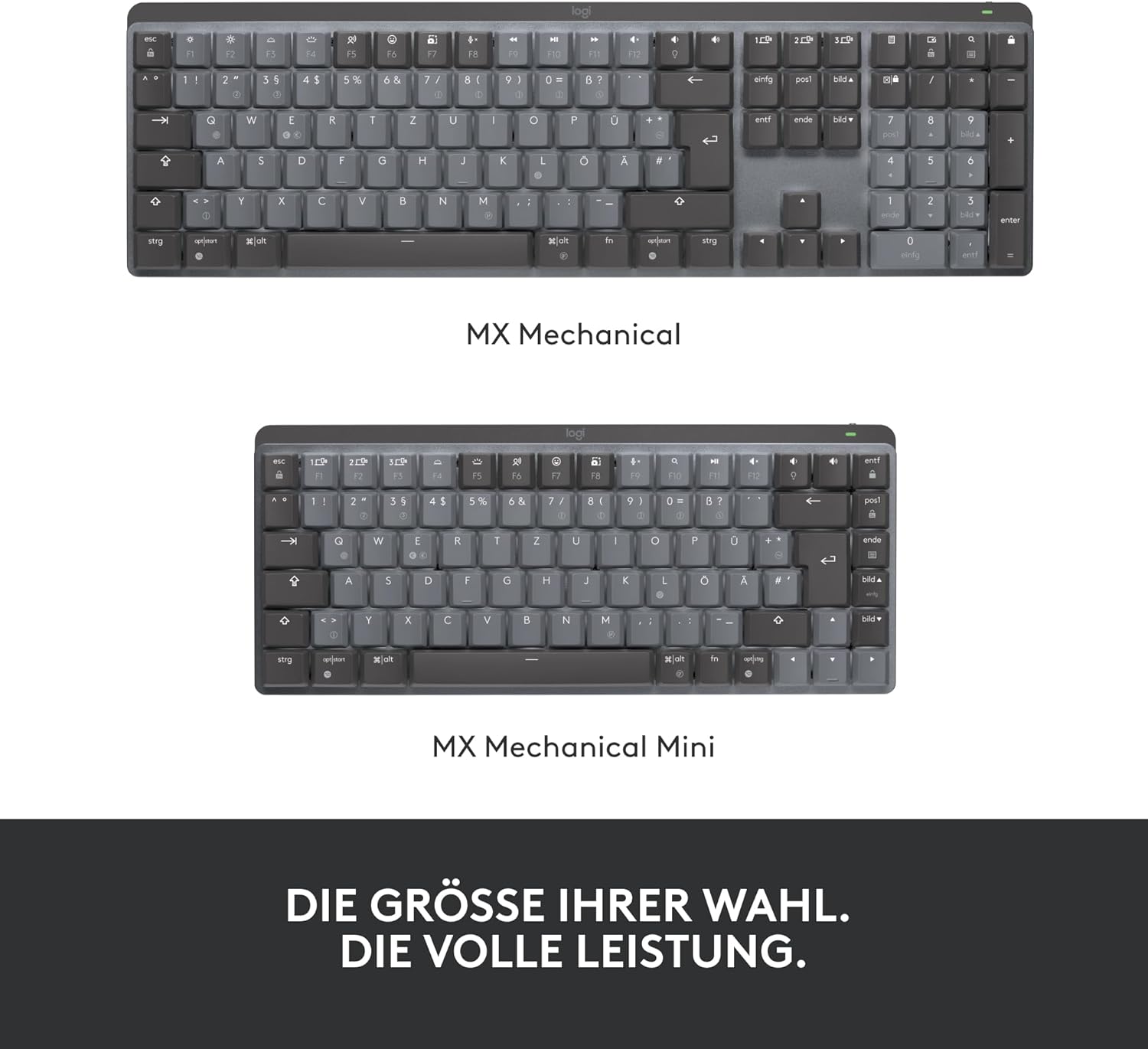 Logitech MX Mechanical Wireless Illuminated Performance Keyboard, тактилни тихи клавиши, подсветка, Bluetooth, USB-C, macOS, Windows, Linux, iOS, Android, метална, немска QWERTZ клавиатура - сива