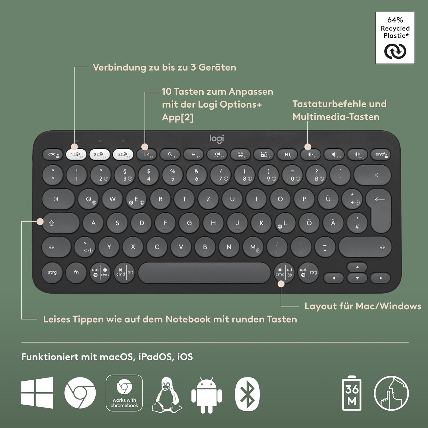 Logitech Pebble Keys 2 K380s, безжична Bluetooth клавиатура за множество устройства с персонализируеми клавишни комбинации, тънка, мобилна, лесно превключване - Windows, macOS, iPadOS, Android, ChromeOS, немска QWERTZ клавиатура, графит