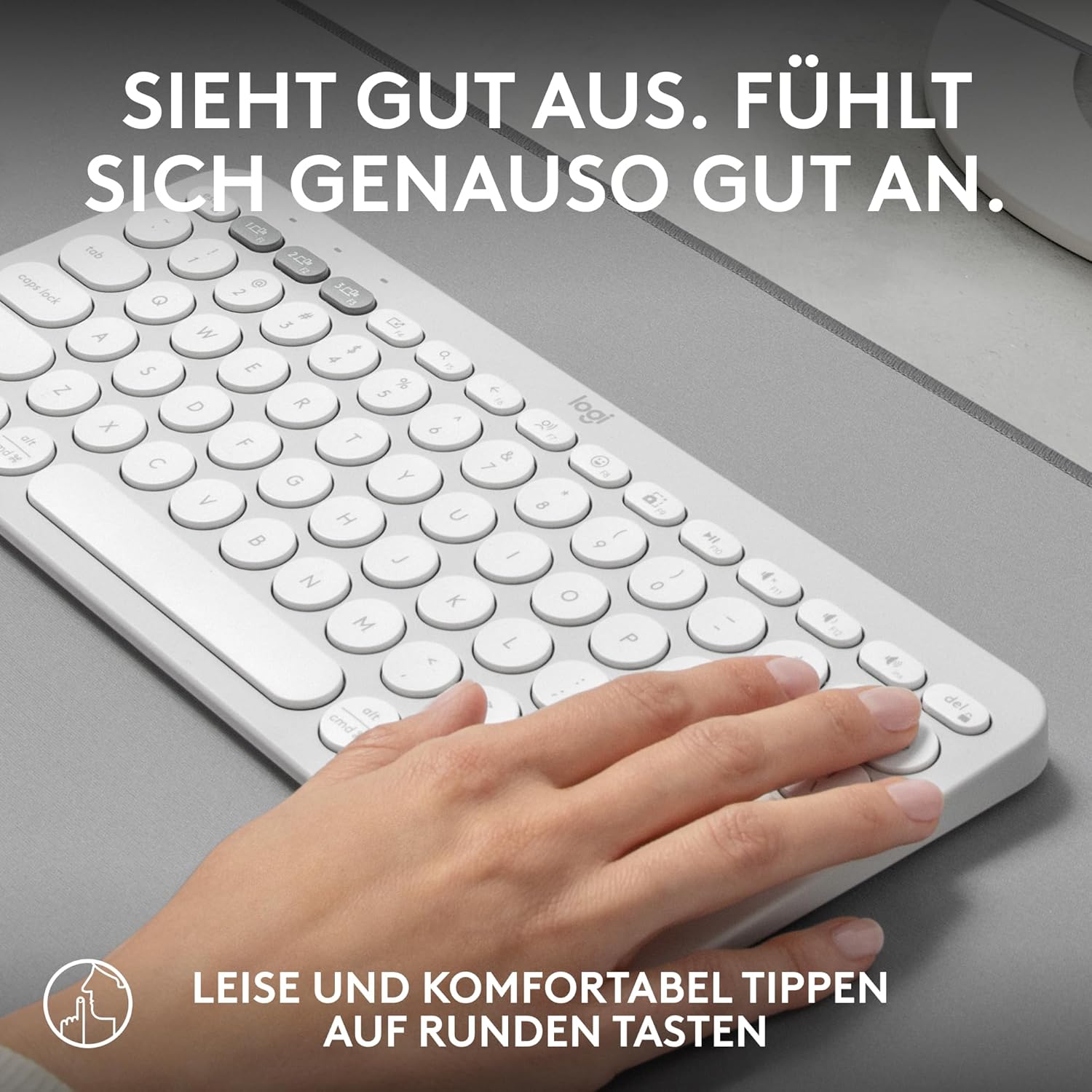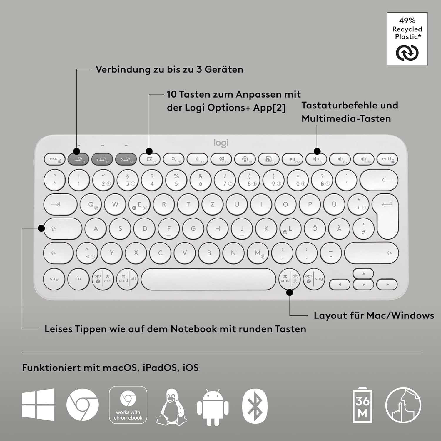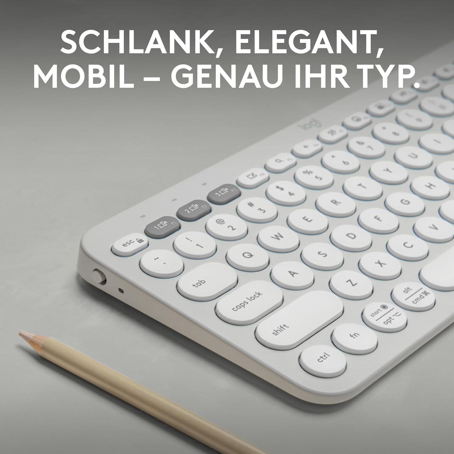 Logitech Pebble Keys 2 K380s, Безжична Bluetooth клавиатура за множество устройства с персонализируеми специални клавиши, Тънка и мобилна, Лесно превключване - Windows, macOS, iPadOS, Android, ChromeOS, Немска QWERTZ клавиатура, Бяла