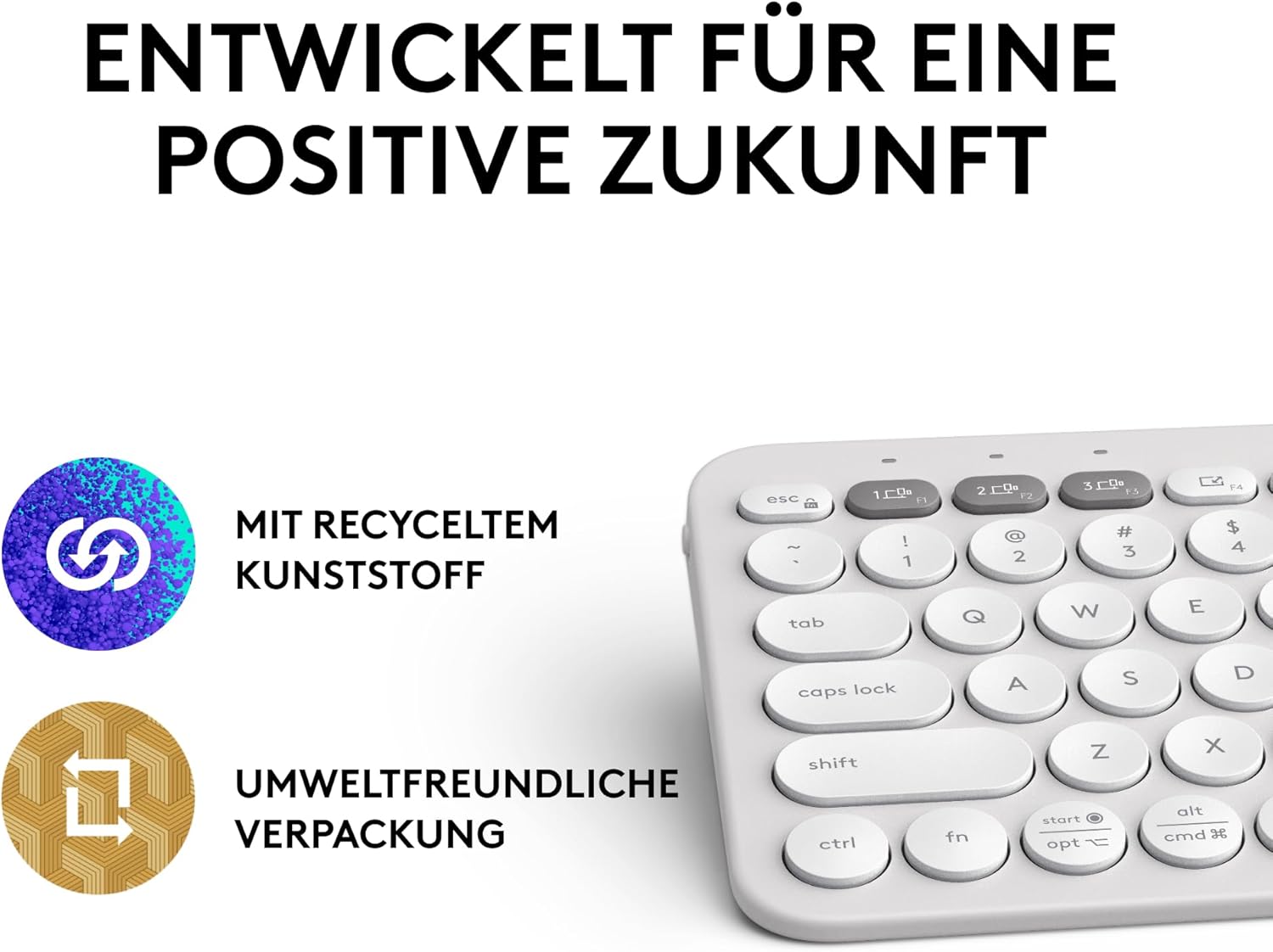 • Елегантен дизайн за чиста съвест: Пластмасовите части съдържат сертифицирана рециклирана пластмаса(1); Pebble Keys 2 K380s: поне 49%, Pebble Mouse 2 M350s: поне 58%