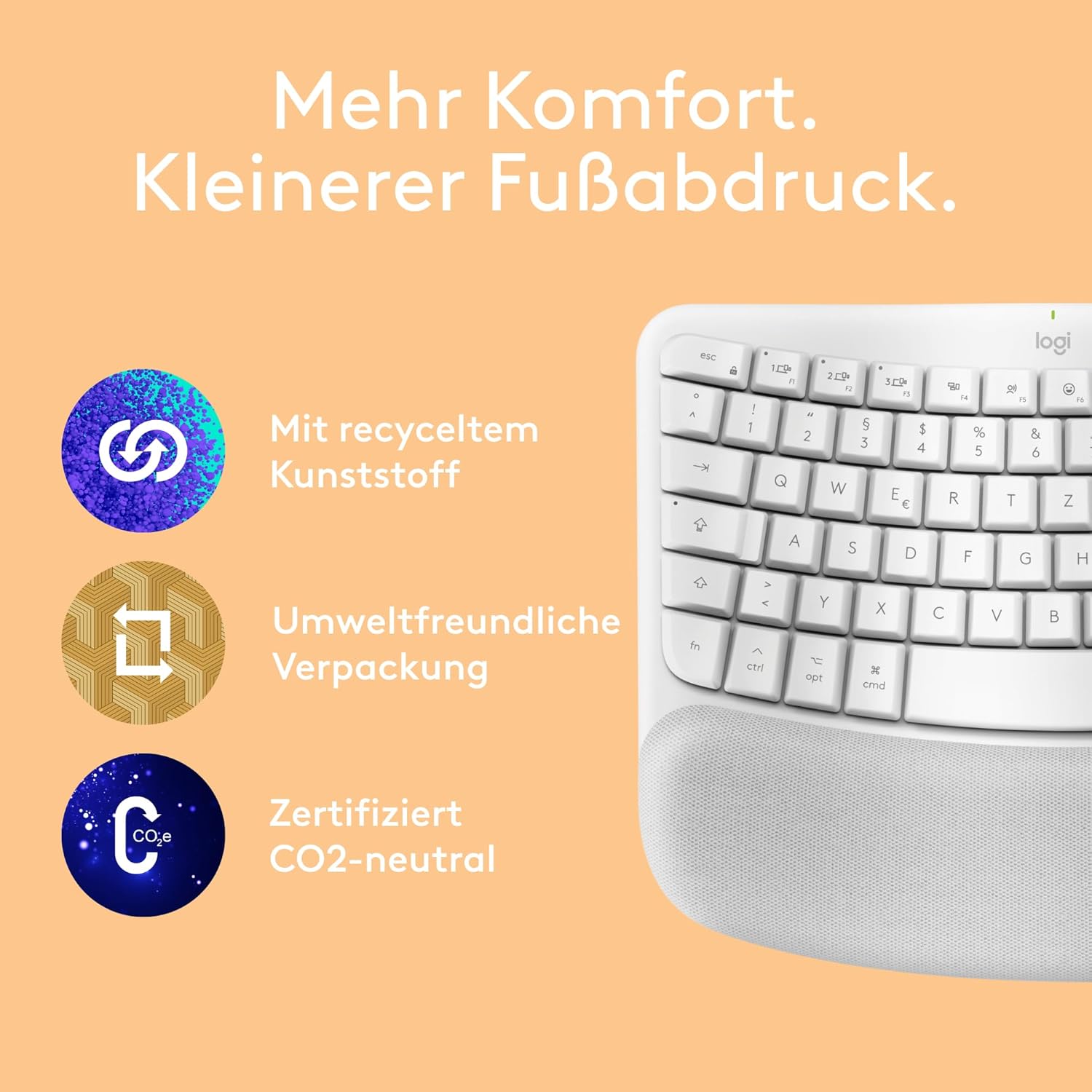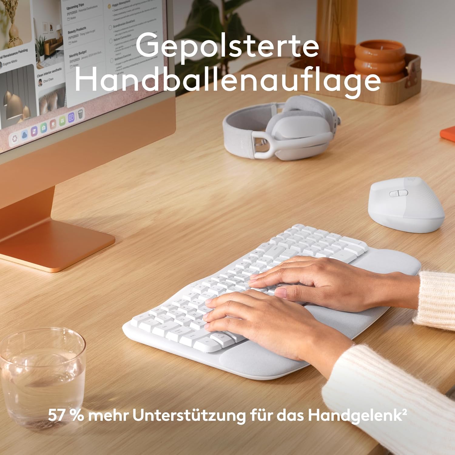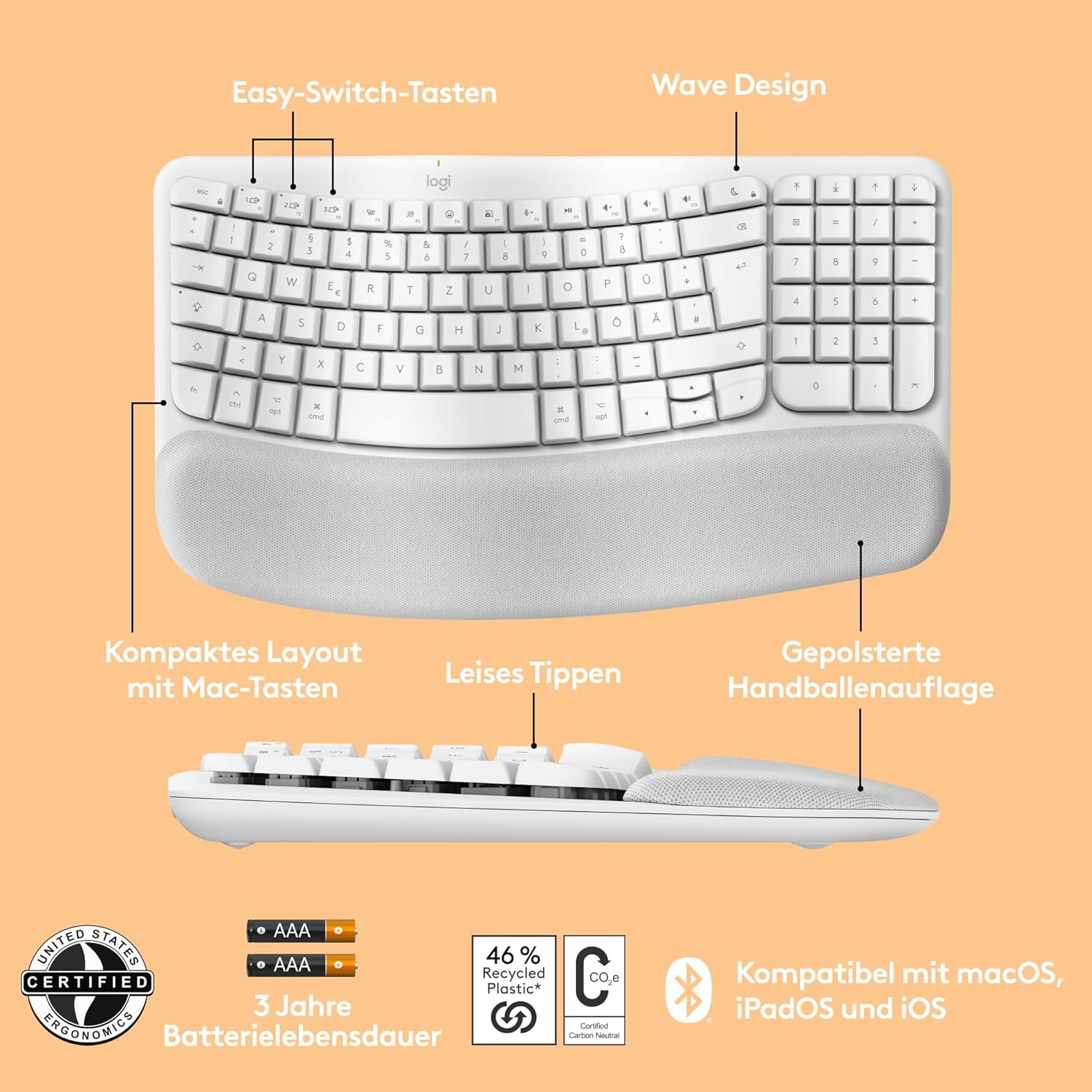 Logitech Wave Keys за Mac, безжична ергономична подплатена поставка за китката, удобно естествено писане, Bluetooth клавиатура, лесно превключване, оптимизирана за Mac, Apple, iPad, QWERTZ DE - бяла