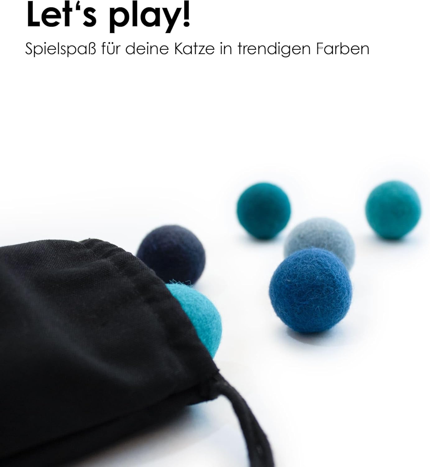 • Комплект котешки топки: Играчката за котки от LucyBalu се състои от комплект от 6 филцови топки в различни цветове. Филцовите котешки топки пристигат у дома в стилна черна памучна торбичка.