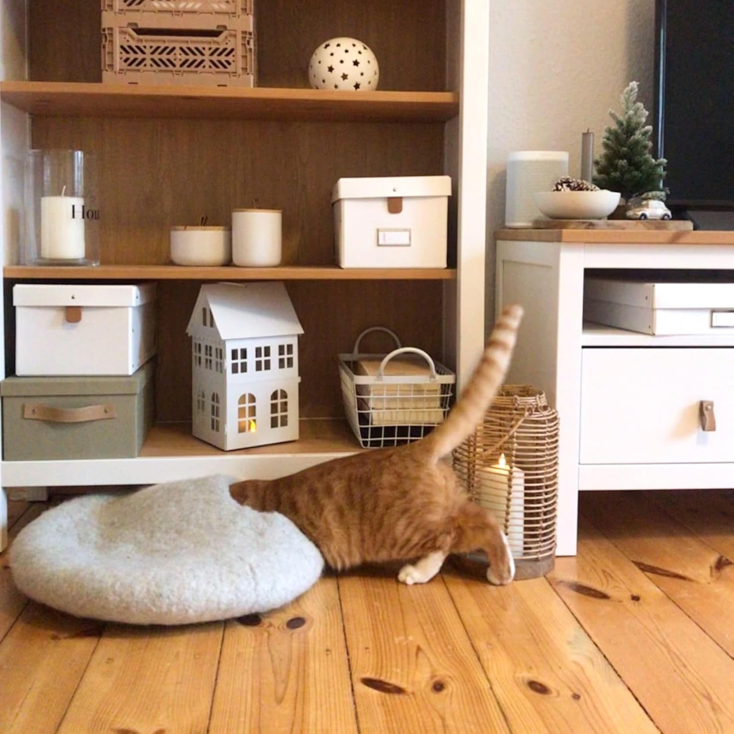 • Пухкаво котешко легло: пухкавото легло „пещерата“ за котки е филцово от 100% новозеландска овча вълна и е естествено меко филцово котешко легло, когато е сгънато. Филцовото котешко легло може да се постави на отоплението, прозореца или дори на стената.