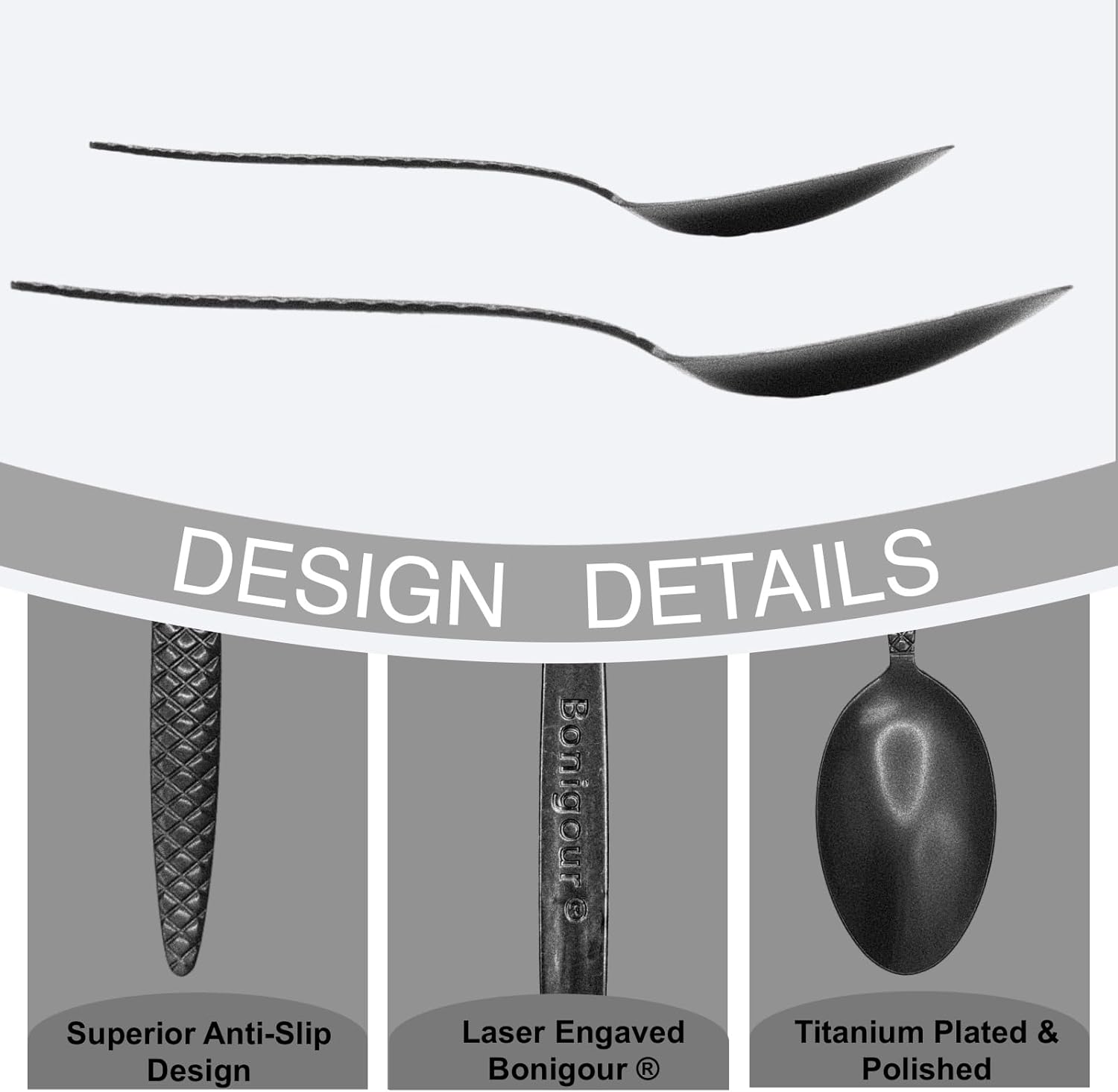 • Гарантирано качество на Bonigour: Нашата лъжица Kunz е изработена от устойчива на корозия неръждаема стомана 18/10 с титаниево покритие за елегантен външен вид, подобрена текстура и превъзходна устойчивост на топлина, драскотини и ежедневна употреба.