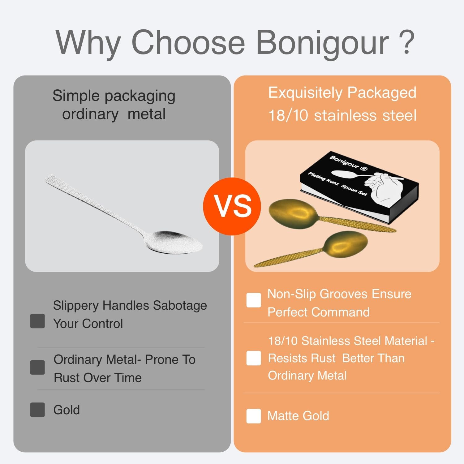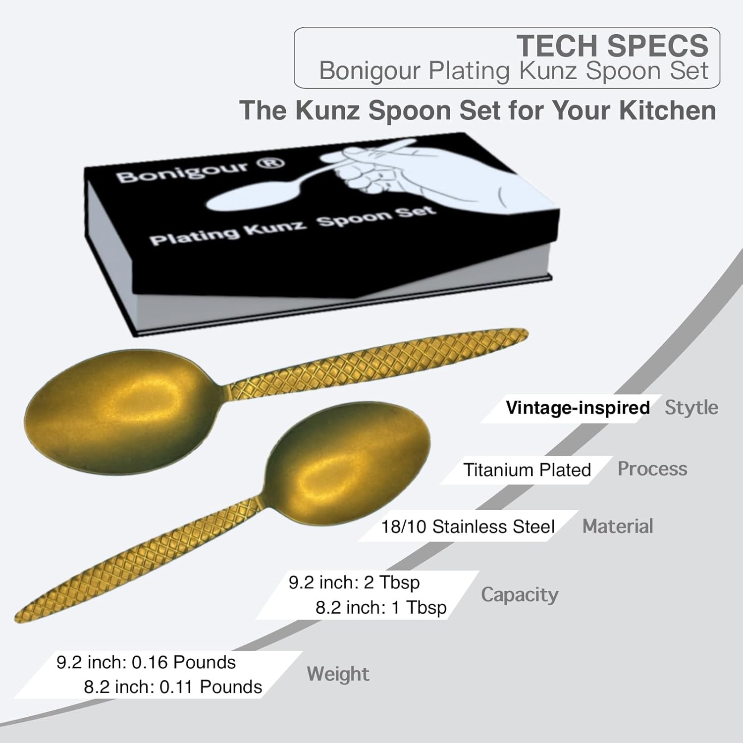 • Гарантирано качество на Bonigour: Нашата лъжица Kunz е изработена от устойчива на корозия неръждаема стомана 18/10 с титаниево покритие за елегантен външен вид, подобрена текстура и превъзходна устойчивост на топлина, драскотини и ежедневна употреба.