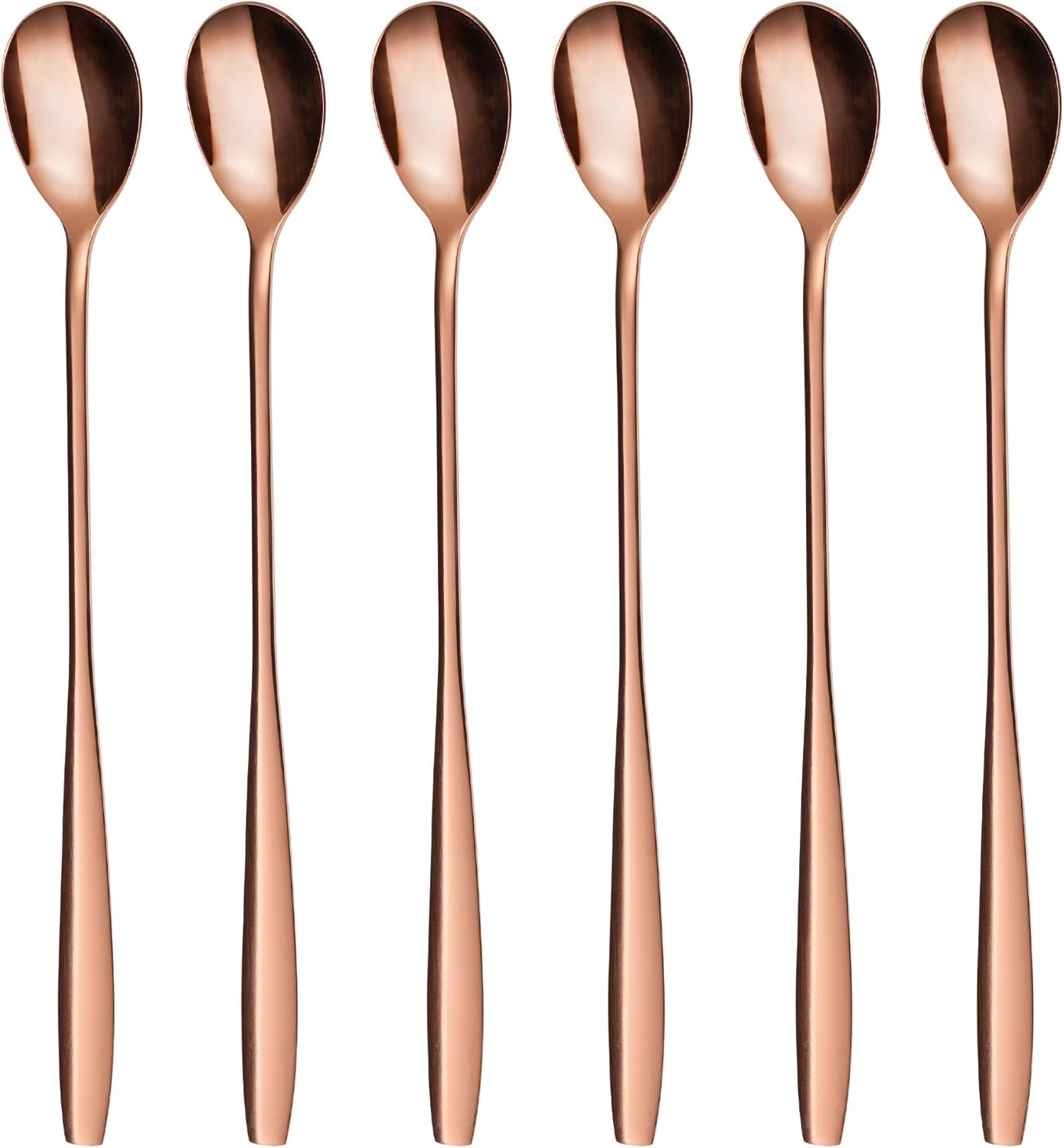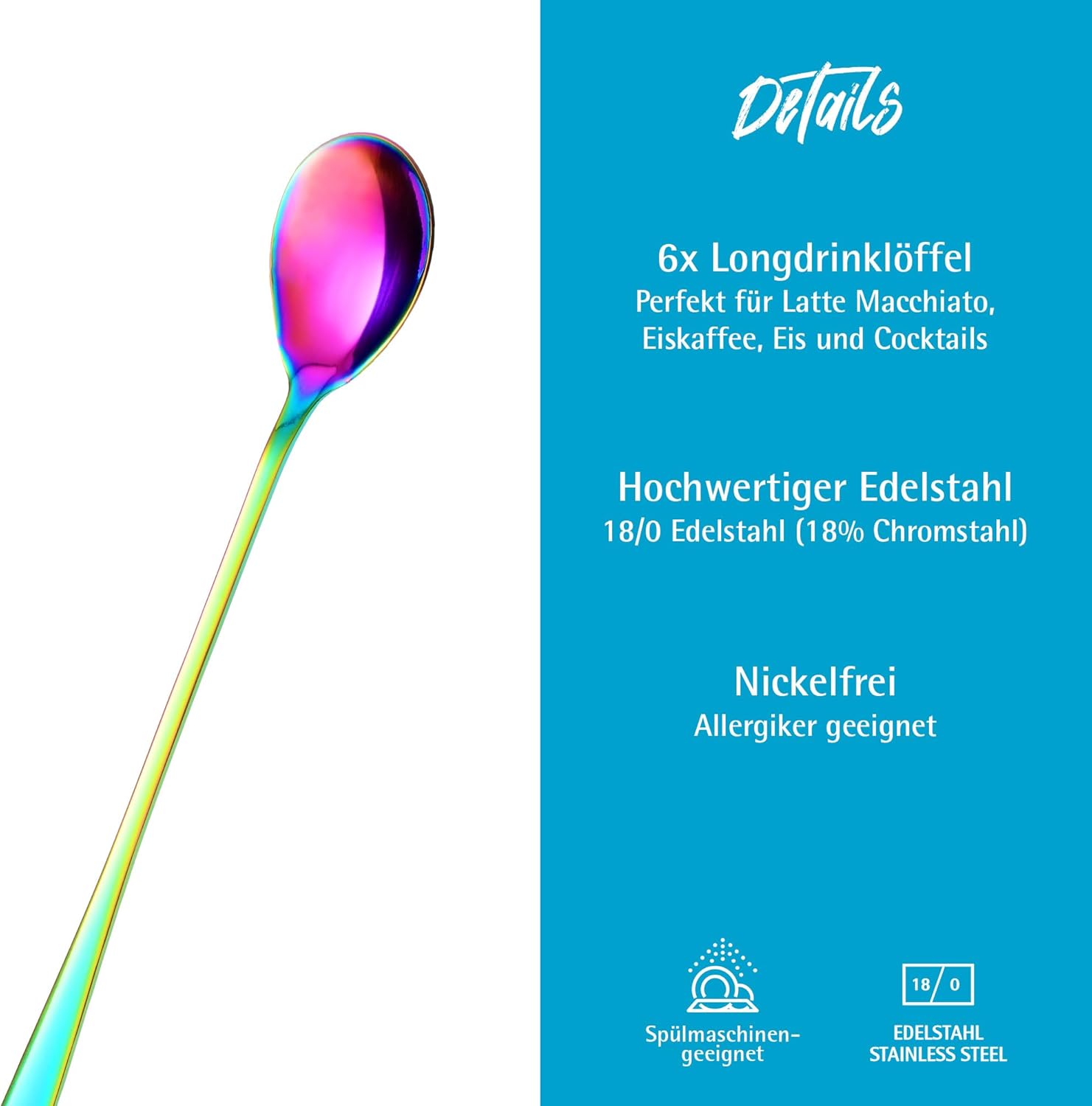 • Перфектна дължина от 22 см за високи чаши и халби. Благодарение на дължината си от 22 см, тези дълги лъжички без усилие достигат дъното на високи чаши. Идеални са като лъжички за сладолед, лате макиато или лъжички за коктейли. С този практичен комплект от шест лъжички сте перфектно подготвени да забавлявате приятели и семейство със стил и да се наслаждавате на всяка напитка с лекота.