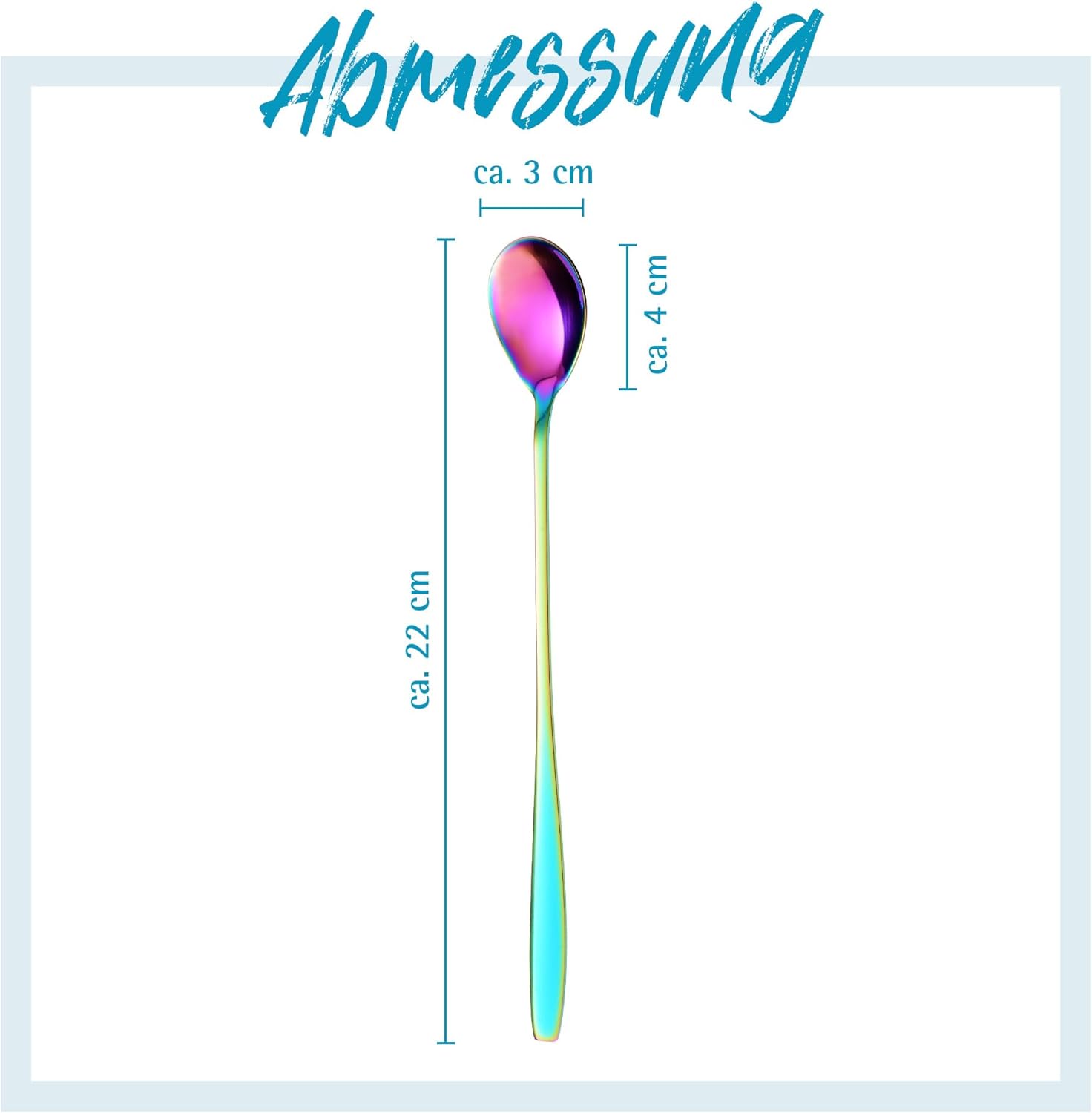 • Висококачествена изработка и удобно боравене: Изработени от неръждаема стомана с внимателно заоблени ръбове, тези дълги 22 см лъжици са приятни в ръката. Независимо дали се използват като лъжици за лате макиато, лъжици за коктейли или лъжици за кисело мляко – те правят всяка напитка и десерт специално преживяване. Подходящи за съдомиялна машина и здрави – перфектният комплект за ежедневна употреба и празнични поводи.