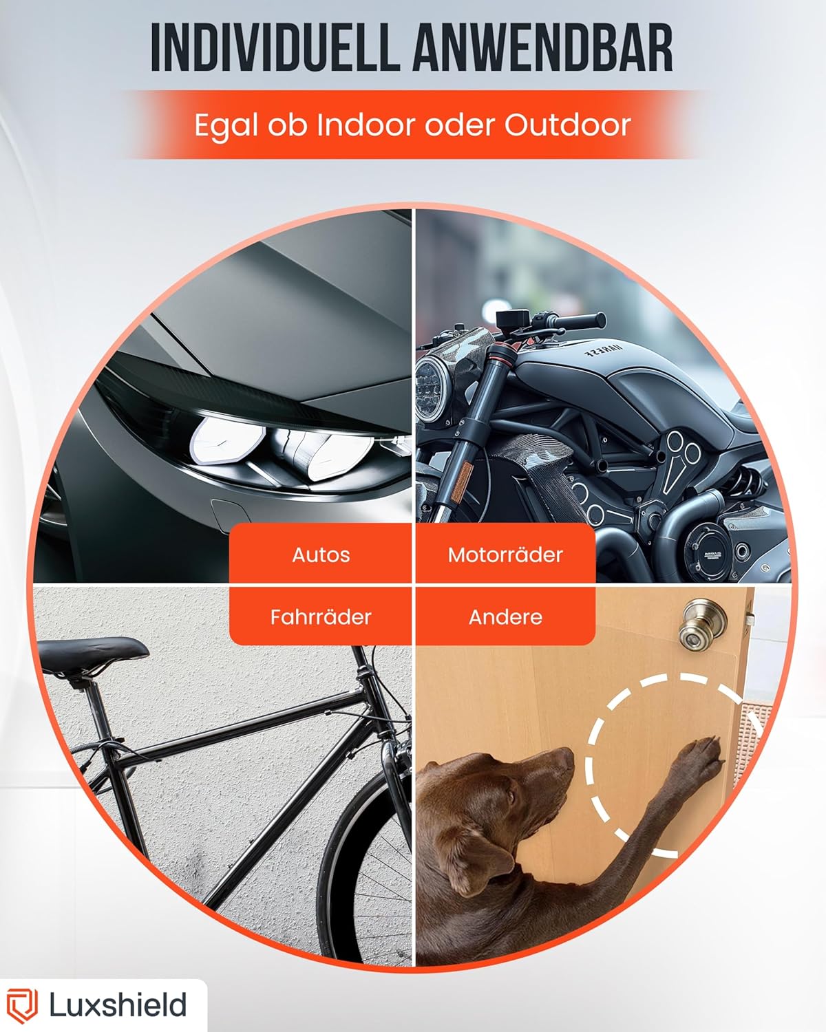 • Ефективно като защитно фолио за боята на велосипед: след удари от песъчинки и камъчета, велосипедът причинява повреди по боята в зоните на верижните вишки, спирачните жила и жилата на скоростите. С прозрачното матово и самозалепващо фолио от Luxshield можете да запазите стила на вашия велосипед (или планински велосипед) и същевременно да защитите натоварените зони със здравия защитен филм. Популярни приложения: защита на верижните вишки, защита на рамката, защита от надраскване.