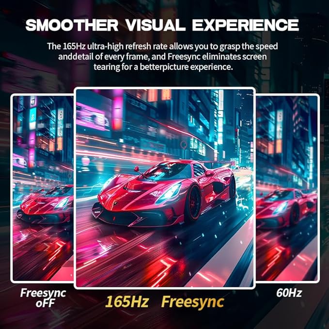 • Честота на опресняване при игри 165Hz + технология за двойна синхронизация: Съвместимост с AMD FreeSync и G-Sync чрез HDMI 2.1/DisplayPort. Интегрирана функция за сканиране срещу накъсване и забавяне при 165Hz течен дисплей.