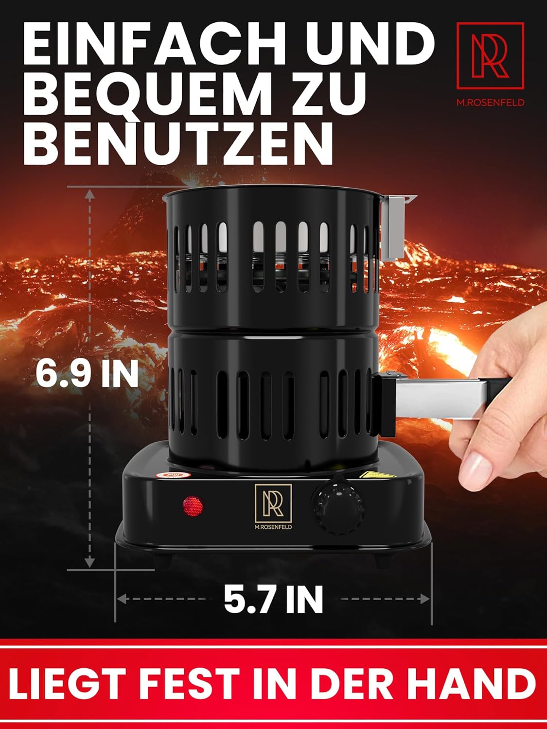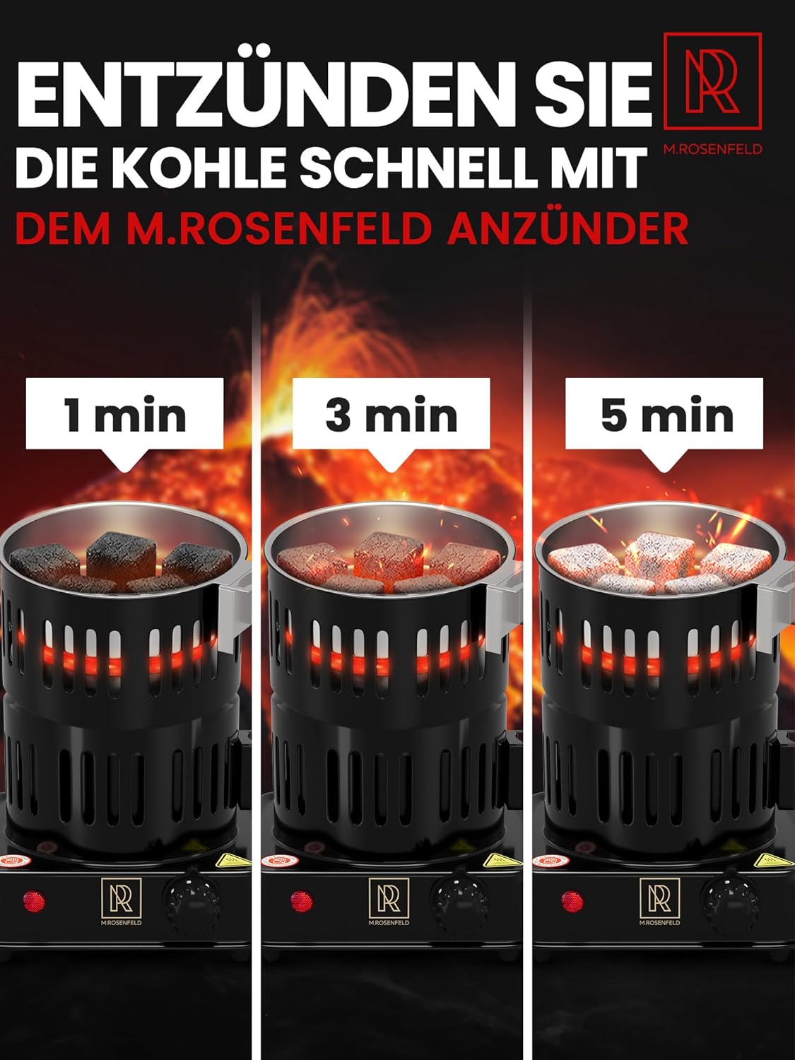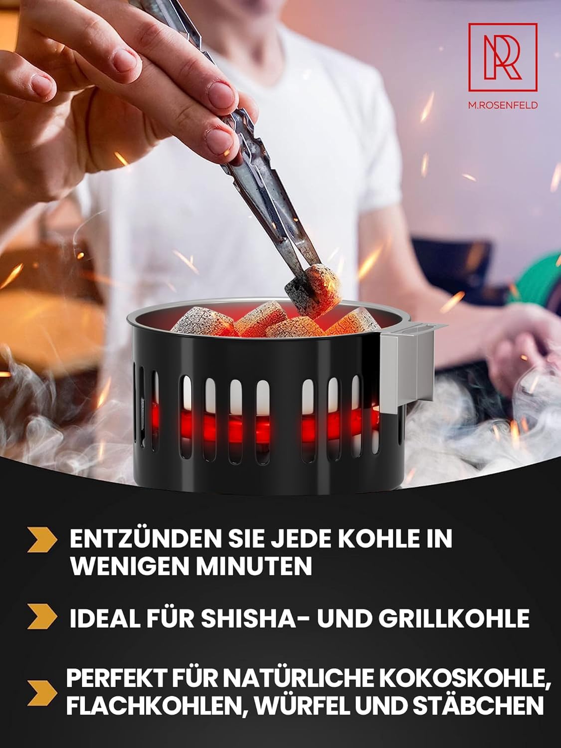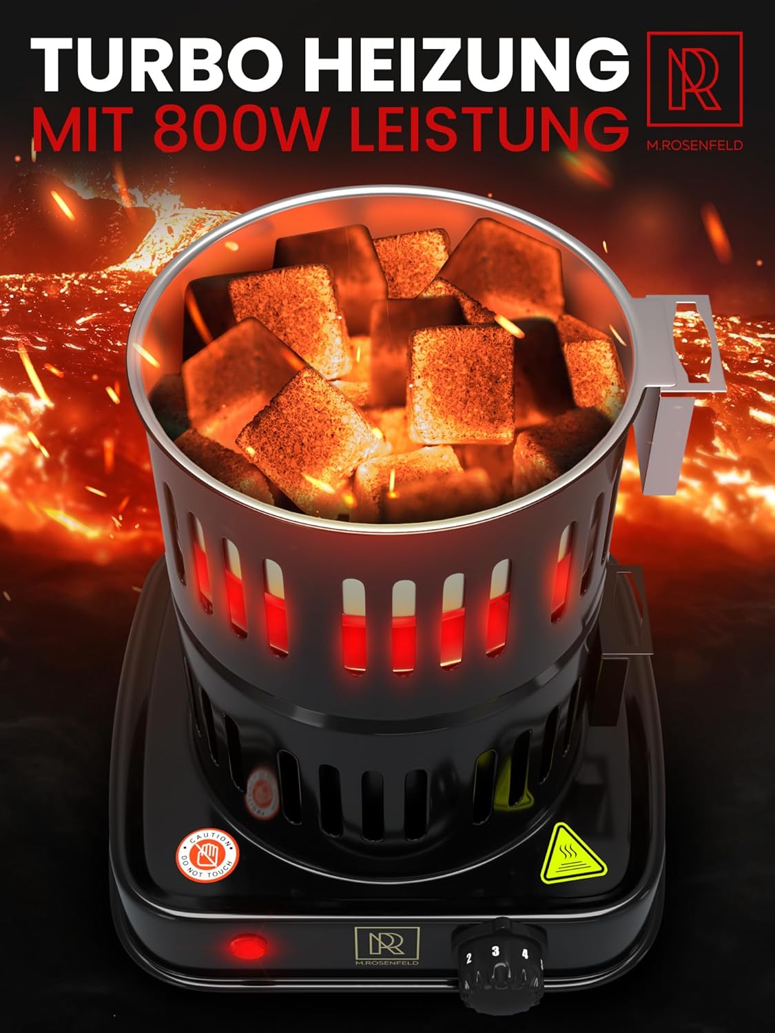 M. ROSENFELD Запалка за дървени въглища Шиша Електрическа 800 W Турбо - Запалка за дървени въглища с изключително дълъг кабел 150 см, подвижна кошница за дървени въглища и 2 щипки - Горелка за дървени въглища за наргиле на кубчета