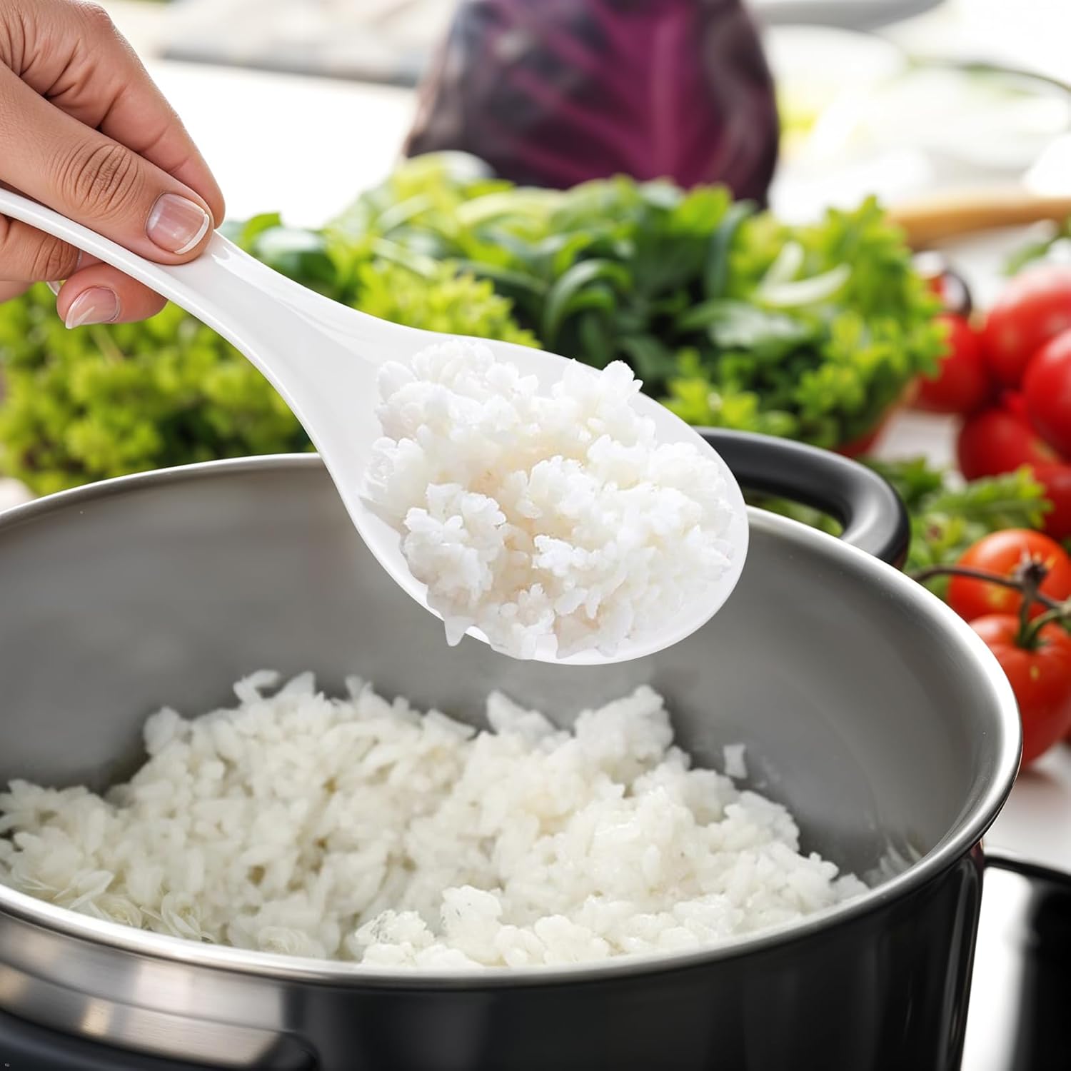 Тази пластмасова лъжица за ориз има гладки ръбове, които предотвратяват надраскване на тенджери и тигани, което я прави незаменим спътник в кухнята.