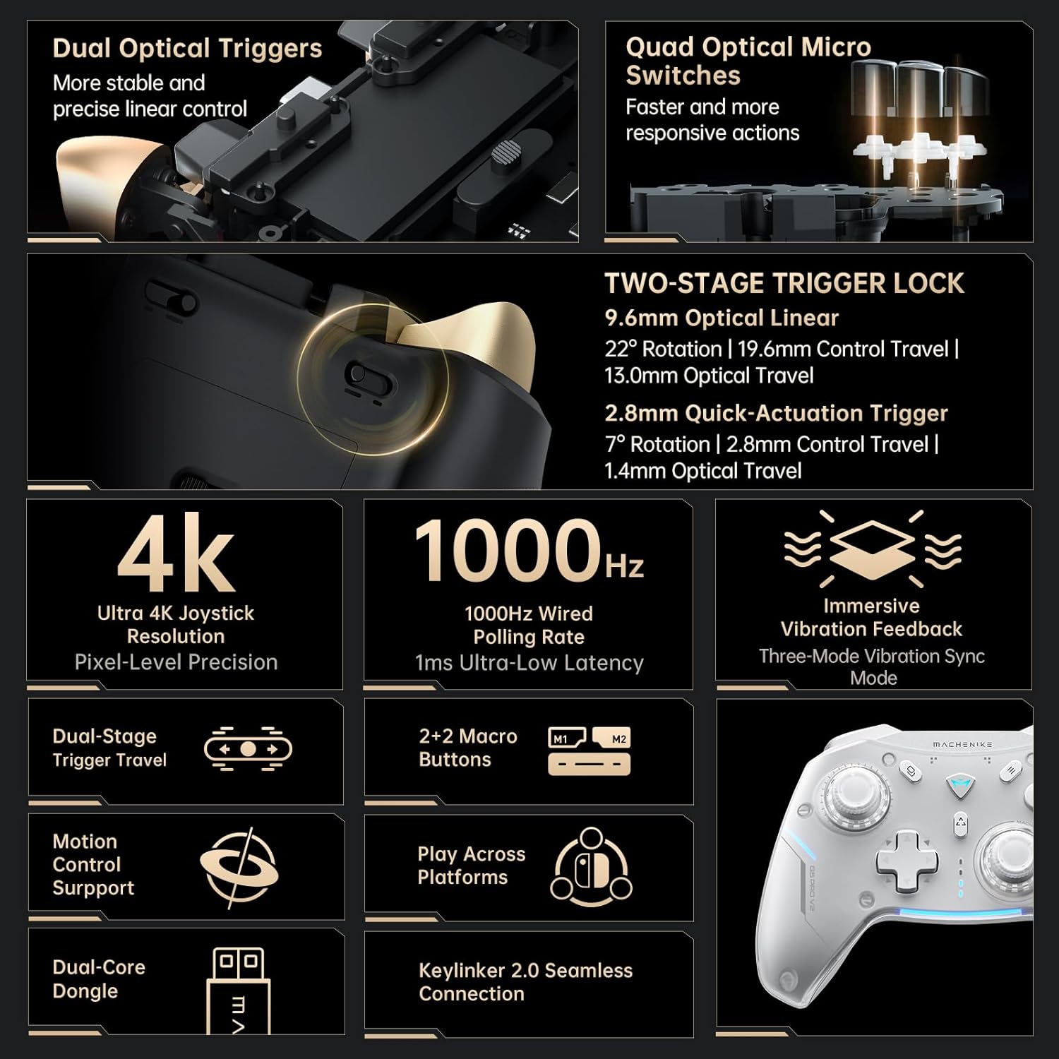 Machenike G5Pro V2 геймърски контролер за PC/NS/IOS/Android (1000Hz честота на семплиране), оптичен и микро превключвател, безжичен геймпад с RGB осветление (USB/2.4G/BT) (черен ST)