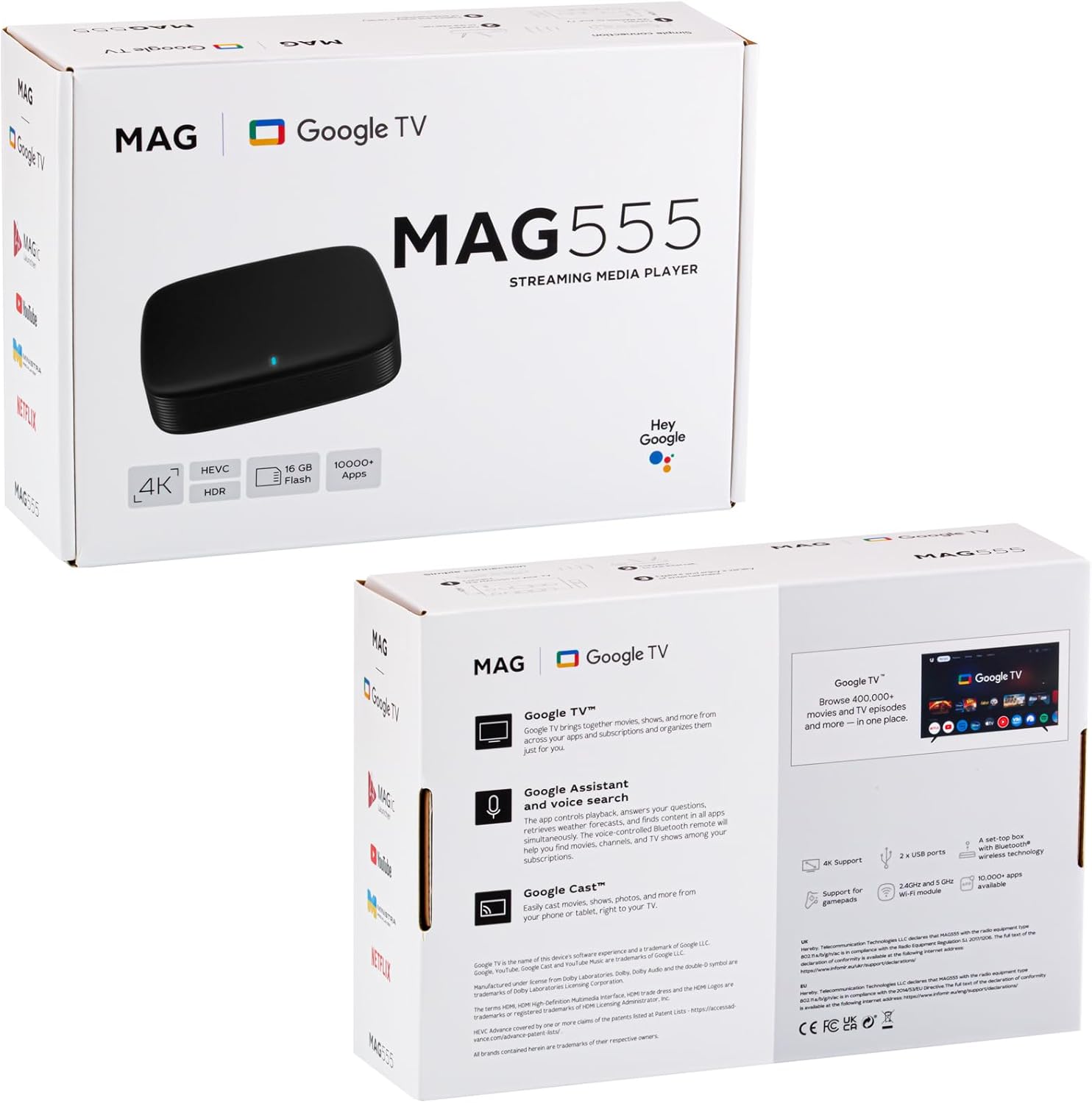 MAG 555 Оригинален Infomir и hb-digital 4K HDR мултимедиен плейър, приемник, HDR с Google Assistant, Netflix, Prime Video, Disney+, YouTube, Dolby Atmos