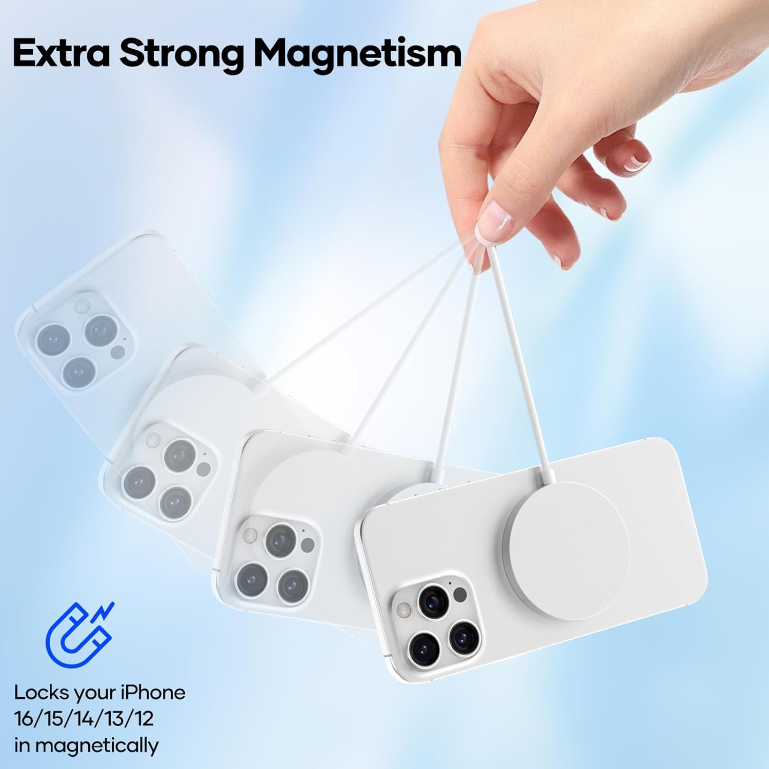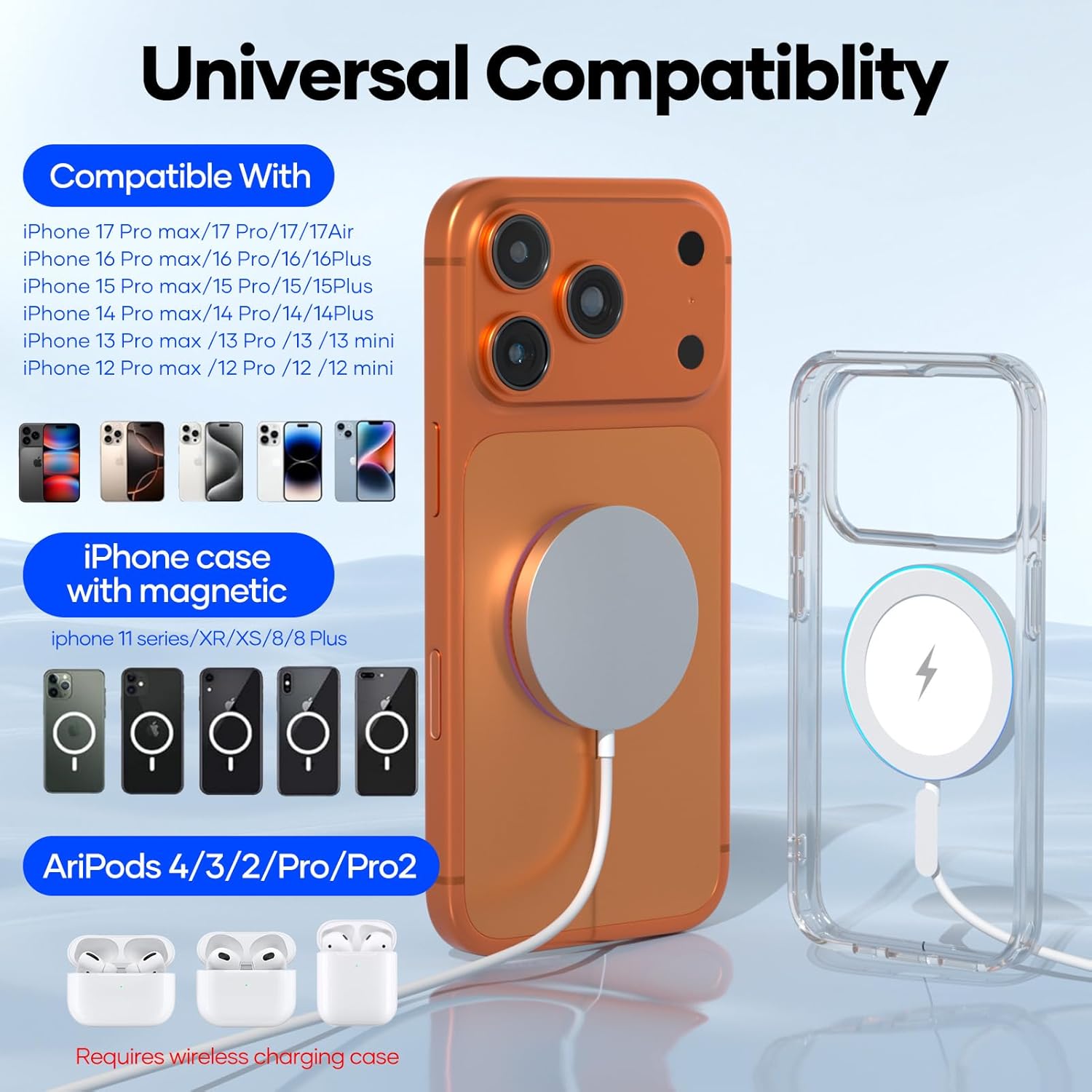 • Специално разработено за мобилни телефони от 17 16 15 14 13 12: Това Mag-Safe зарядно устройство е съвместимо с iPhone 17 / 17 Air / 17 Pro / 17 Pro / 17 Pro Max, iPhone 16 / 16 Plus / 16 Pro / 16 Pro Max, iPhone 15 / 15 Plus / 15 Pro / 15 Pro. iPhone Max, iPhone 14 / 14 Plus / 14 Pro / 14 Pro Max, iPhone 13 / 13 Pro / 13 Pro Max / 13 Mini, iPhone 12 / 12 Pro / 12 Pro Max / 12 Mini и Air Pods 3 2 Pro, както и моделите iPhone 8 и по-нови модели с магнитни калъфи, също могат да се зареждат магнитно. ️Забележка: Моля, използвайте Mag-Safe калъфа за по-силно намагнитване, обикновените калъфи ще отслабят магнитната адсорбция.