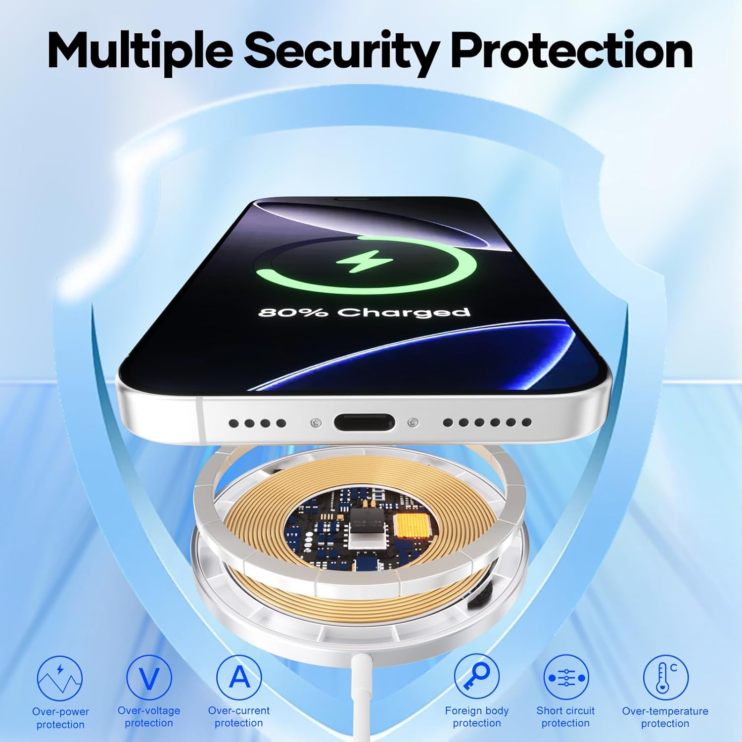 • Безопасна интелигентна защита: нашата магнитна станция за зареждане на iPhone се състои от корпус от алуминиева сплав с по-добра система за разсейване на топлината, вграден чип за управление на зареждането с множество защитни функции, като например свръхток, пренапрежение, прегряване, късо съединение и др., което предпазва устройството ви от повреди от презареждане и ви предлага най-безопасната среда за зареждане.