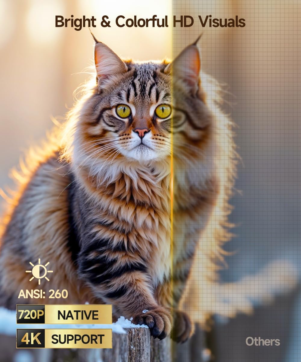• Качество на изображението и цвят: Проекторът Magcubic предлага резолюция от 1280 x 720 пиксела, поддържа 4K и 8K HDR декодиране, 260 ANSI. Усъвършенстваните LCD алгоритми поддържат HDR изображения и адаптивно управление на цветовете на сцената, оптимизирайки цветовото пространство за истински, ярки цветове. С проекционно съотношение 0.8:1, той може да проектира върху екран от 35" до 140". В комбинация с въртящата се на 180 градуса скоба, можете да гледате филми и телевизионни предавания от всякакъв ъгъл за комфортно гледане.