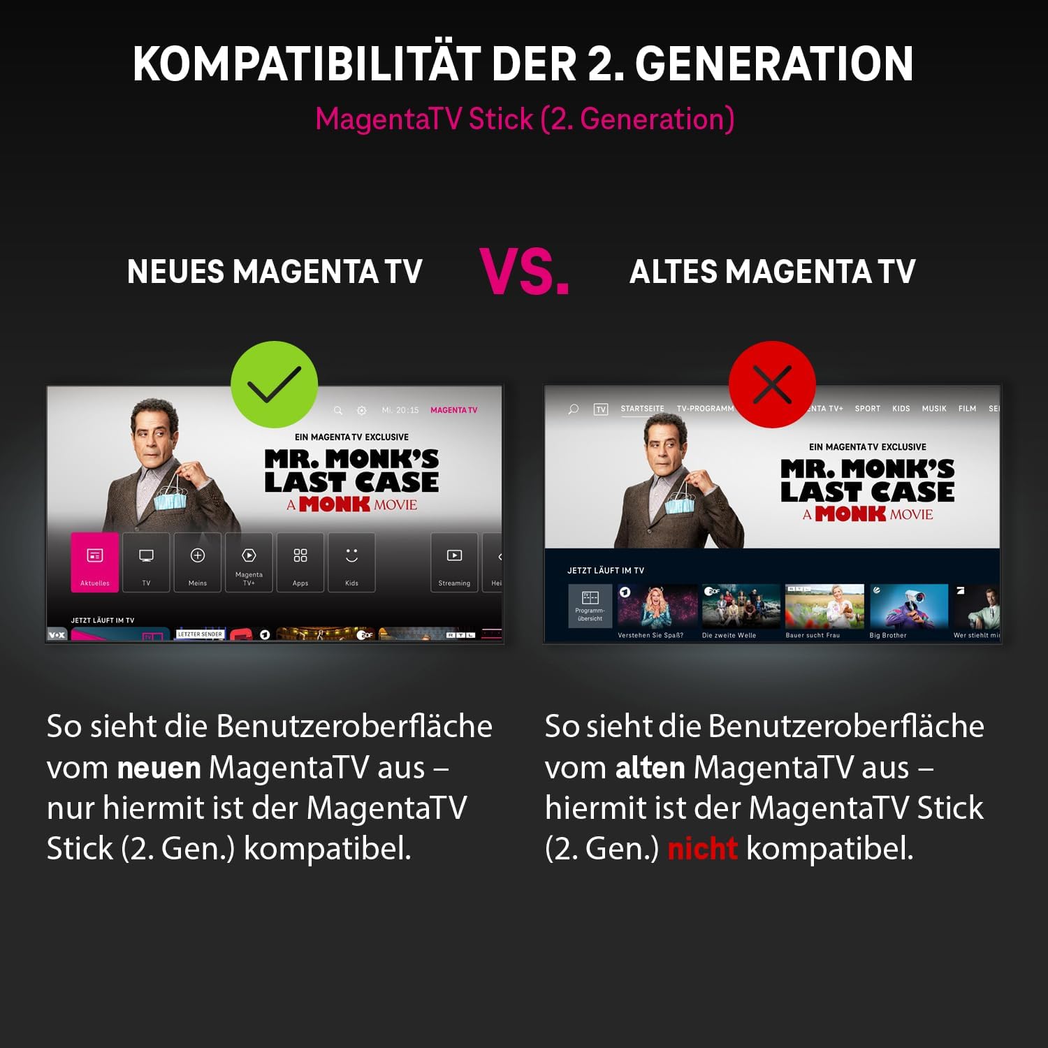 • Просто добър TV Stick: Гледайте публични и частни телевизионни канали в HD с MagentaTV* 160 – гъвкаво на всеки телевизор с HDMI вход. Просто се свържете към Wi-Fi и започнете. С 16 GB, MagentaTV Stick (2-ро поколение) има достатъчно място за съхранение.