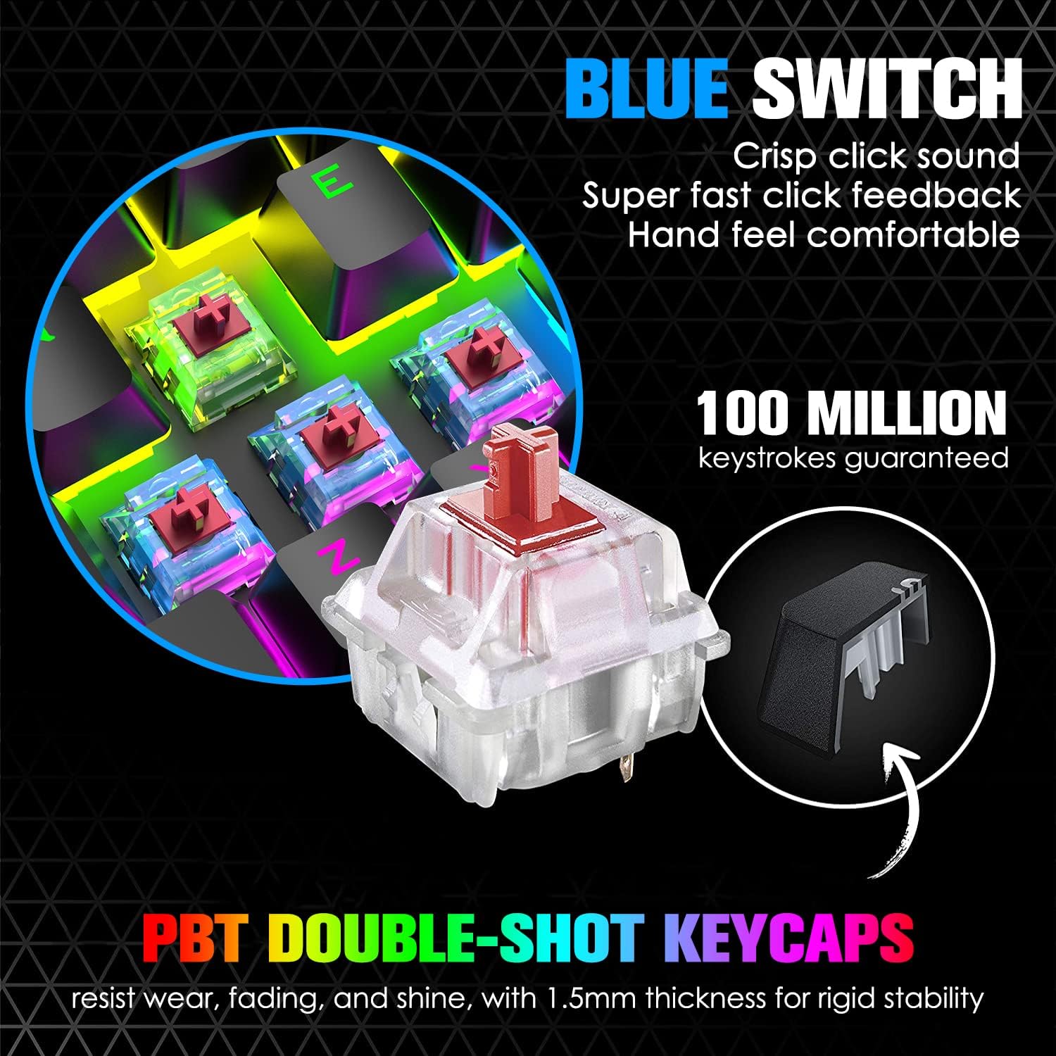 • Механична USB геймърска клавиатура с RGB подсветка, 14 различни светлинни ефекта и 9 цвята, скорост на дишане, променлива скорост на дишане или режим на постоянно осветление. Прецизно проектираните клавиши на компютърната клавиатура осигуряват кристално ясна, равномерна подсветка, дори при липса на светлина, тя е много подходяща и за игри през нощта. Можете също така да регулирате яркостта на подсветката и честотата на дишане според вашите желания.