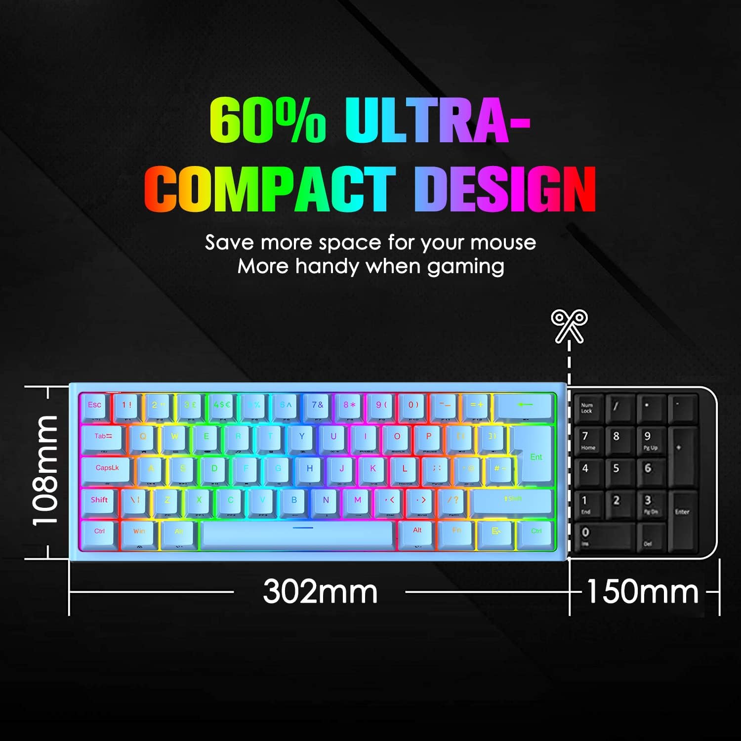 • Мини 60% геймърска клавиатура: с ултракомпактно разположение с 62 клавиша. Червеният превключвател е безшумен. Тя има минимално съпротивление и няма тактилни сблъсъци. Повечето хора смятат, че усещането за „плавен“ и „бърз ход“ я прави особено популярна сред любителите на игрите. Научният трапецовиден дизайн на клавишите е ергономичен, поддържа ръцете в най-естествено състояние и намалява умората на ръцете след продължителна употреба. Така че е предназначена за геймъри, офис служители, програмисти, учители по машинопис и редактори.