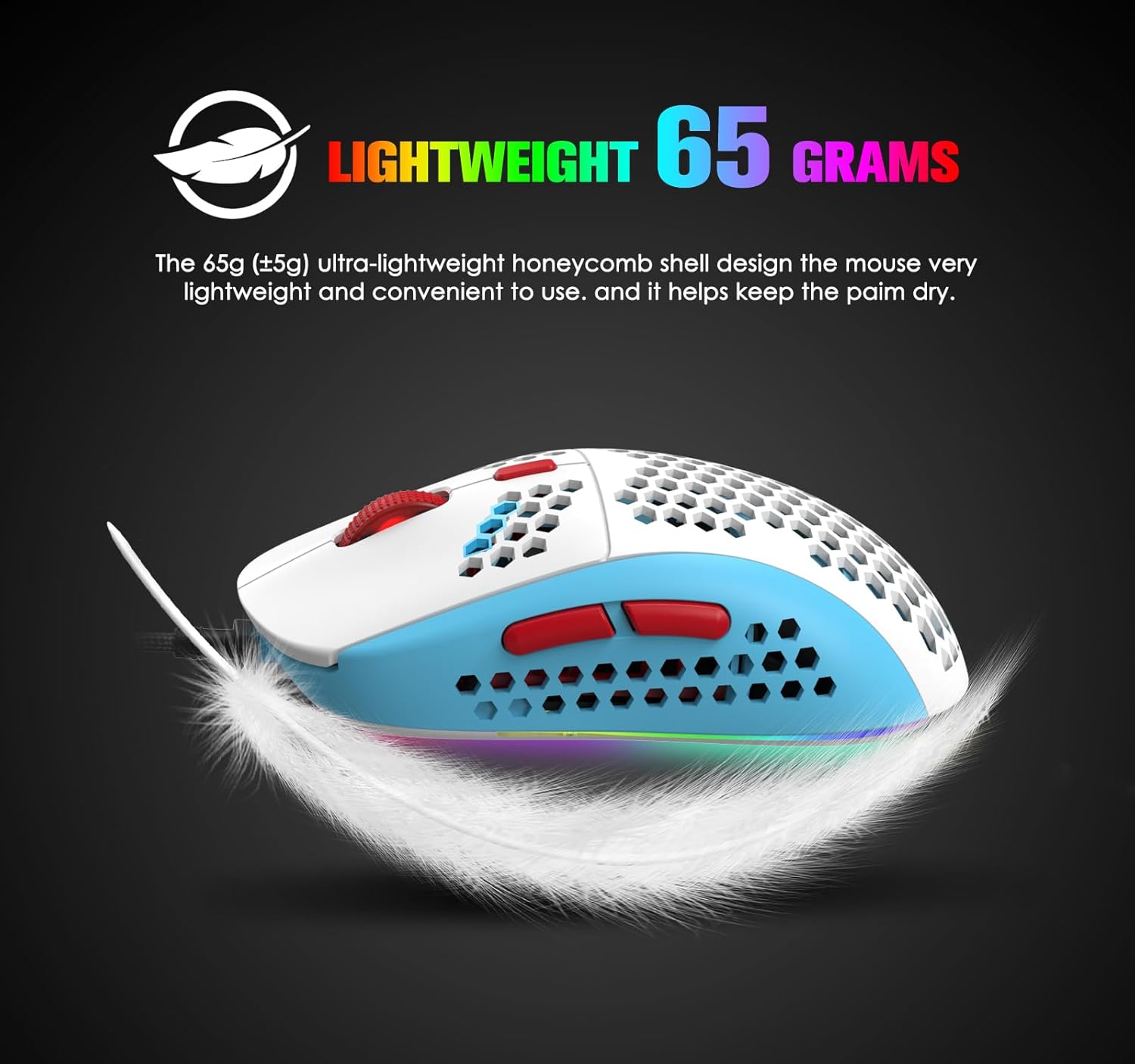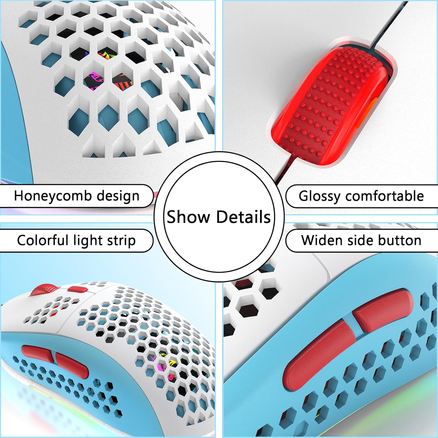• ГЕЙМЪРСКА МИШКА С КАБЕЛ И ФОРМА С ПЧЕЛЕНА ПЧЕЛА Можете да регулирате скоростта на светлината, DPI стойността, да зададете функции на клавишите и да зададете любимия режим на ефекти. Специално проектирана за игри, стандартните бутони за напред и назад са лесни за употреба. Подложка за мишка, изработена от естествен каучук, без специфична миризма, здравословна и екологична. Плътното засенчване и неплъзгащата се основа от естествен каучук могат да задържат масата здраво. Висококачествените меки материали ви осигуряват комфорт и контрол над мишката.