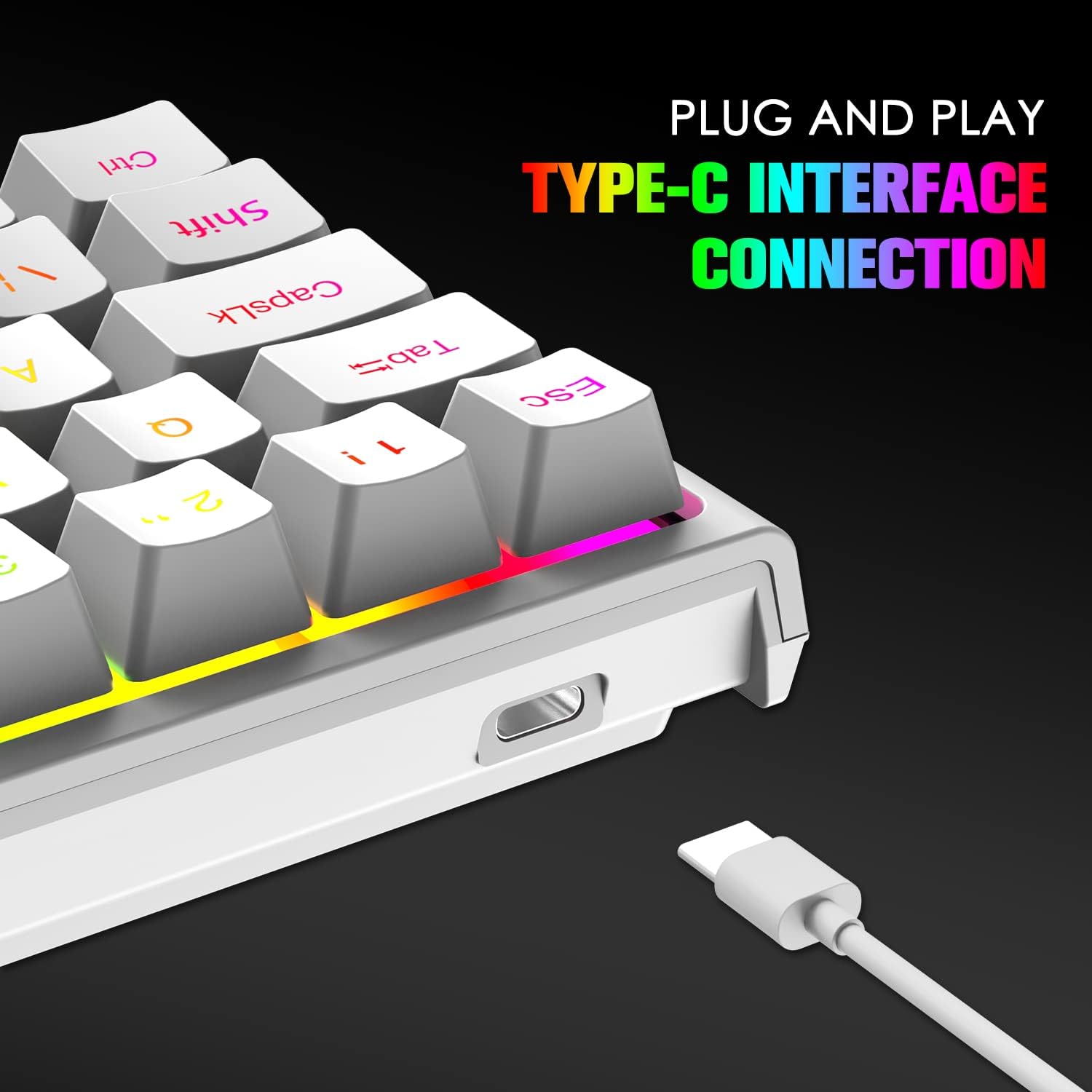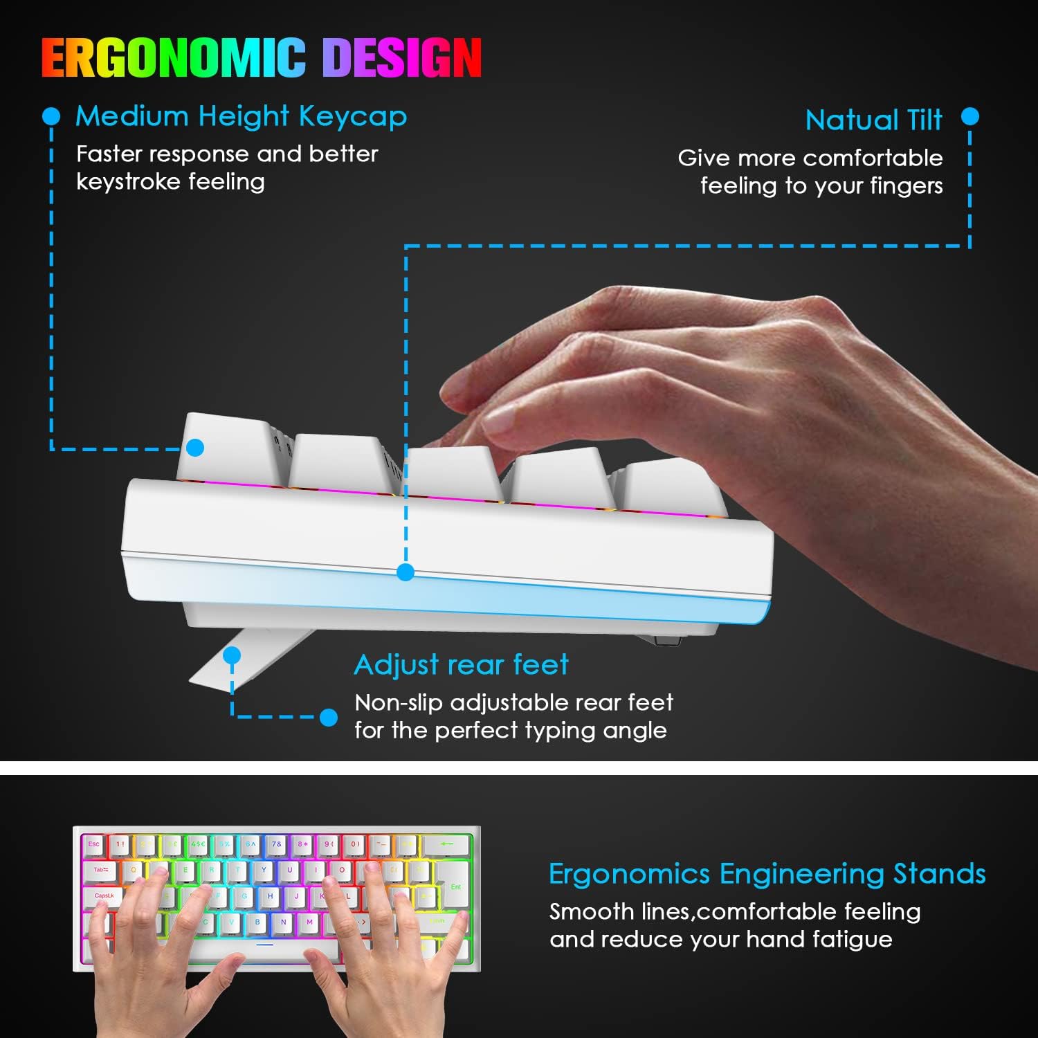 • Мини 60% геймърска клавиатура: с ултракомпактно разположение с 62 клавиша. Червеният превключвател е безшумен. Тя има минимално съпротивление и няма тактилни сблъсъци. Повечето хора смятат, че усещането за „плавен“ и „бърз ход“ я прави особено популярна сред любителите на игрите. Научният трапецовиден дизайн на клавишите е ергономичен, поддържа ръцете в най-естествено състояние и намалява умората на ръцете след продължителна употреба. Така че е предназначена за геймъри, офис служители, програмисти, учители по машинопис и редактори.