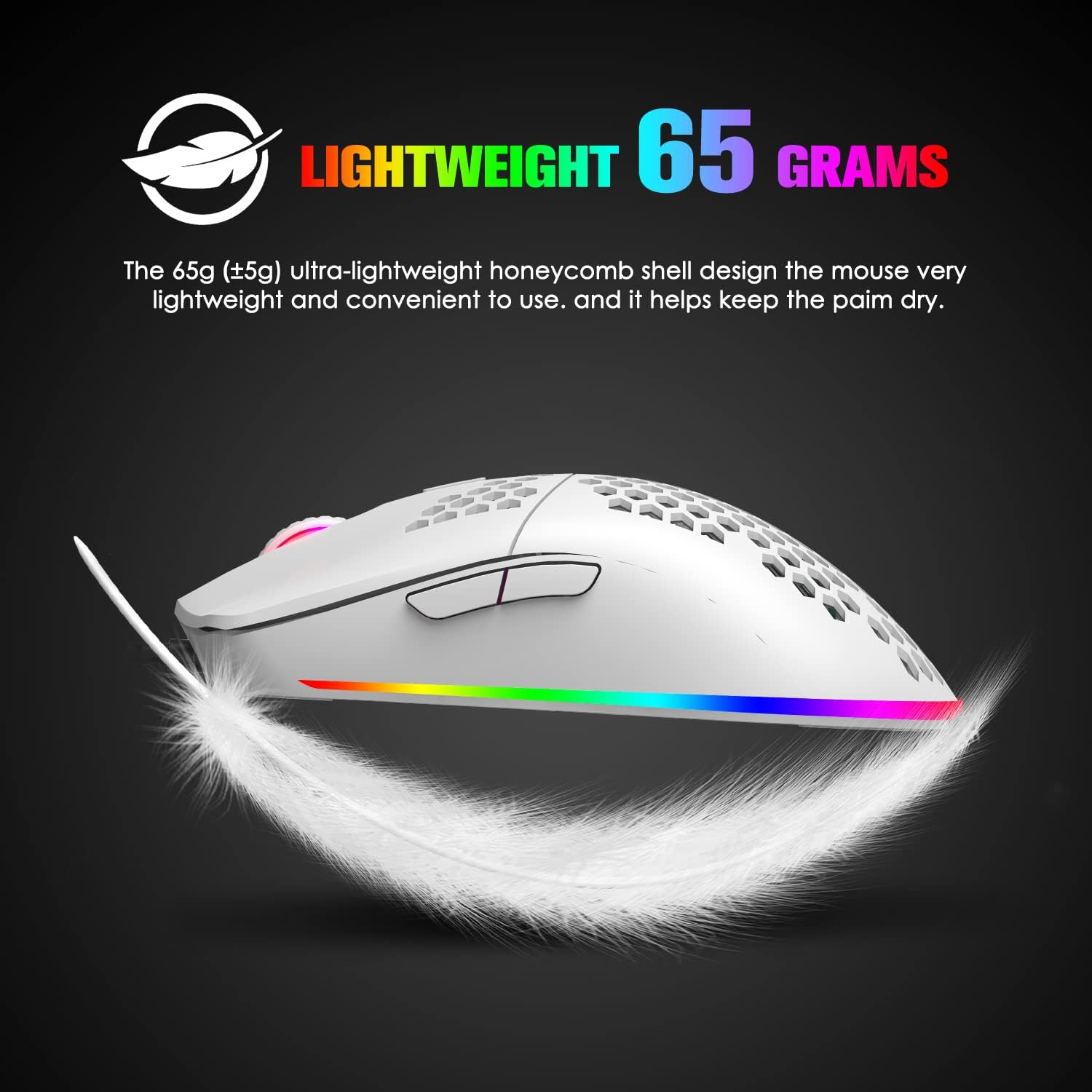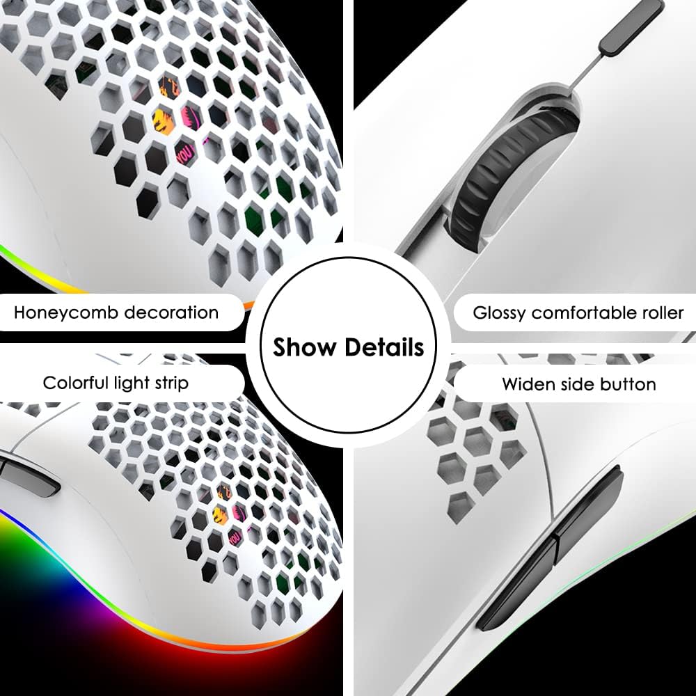 • ГЕЙМЪРСКА МИШКА С КАБЕЛ И ФОРМА С ПЧЕЛЕНА ПЧЕЛА Можете да регулирате скоростта на светлината, DPI стойността, да зададете функции на клавишите и да зададете любимия режим на ефекти. Специално проектирана за игри, стандартните бутони за напред и назад са лесни за употреба. Подложка за мишка, изработена от естествен каучук, без специфична миризма, здравословна и екологична. Плътното засенчване и неплъзгащата се основа от естествен каучук могат да задържат масата здраво. Висококачествените меки материали ви осигуряват комфорт и контрол над мишката.