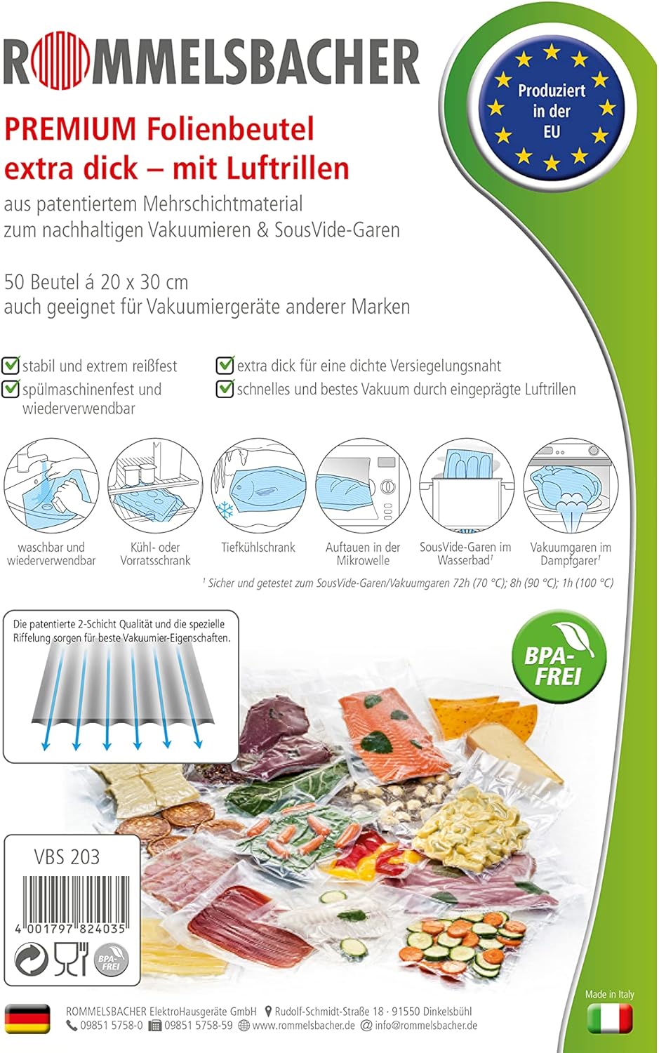 • Най-добри свойства на материала за непрекъснати, херметични и стабилни запечатващи шевове, може да се нагрява до 100°C, идеален и за метода на готвене sous vide