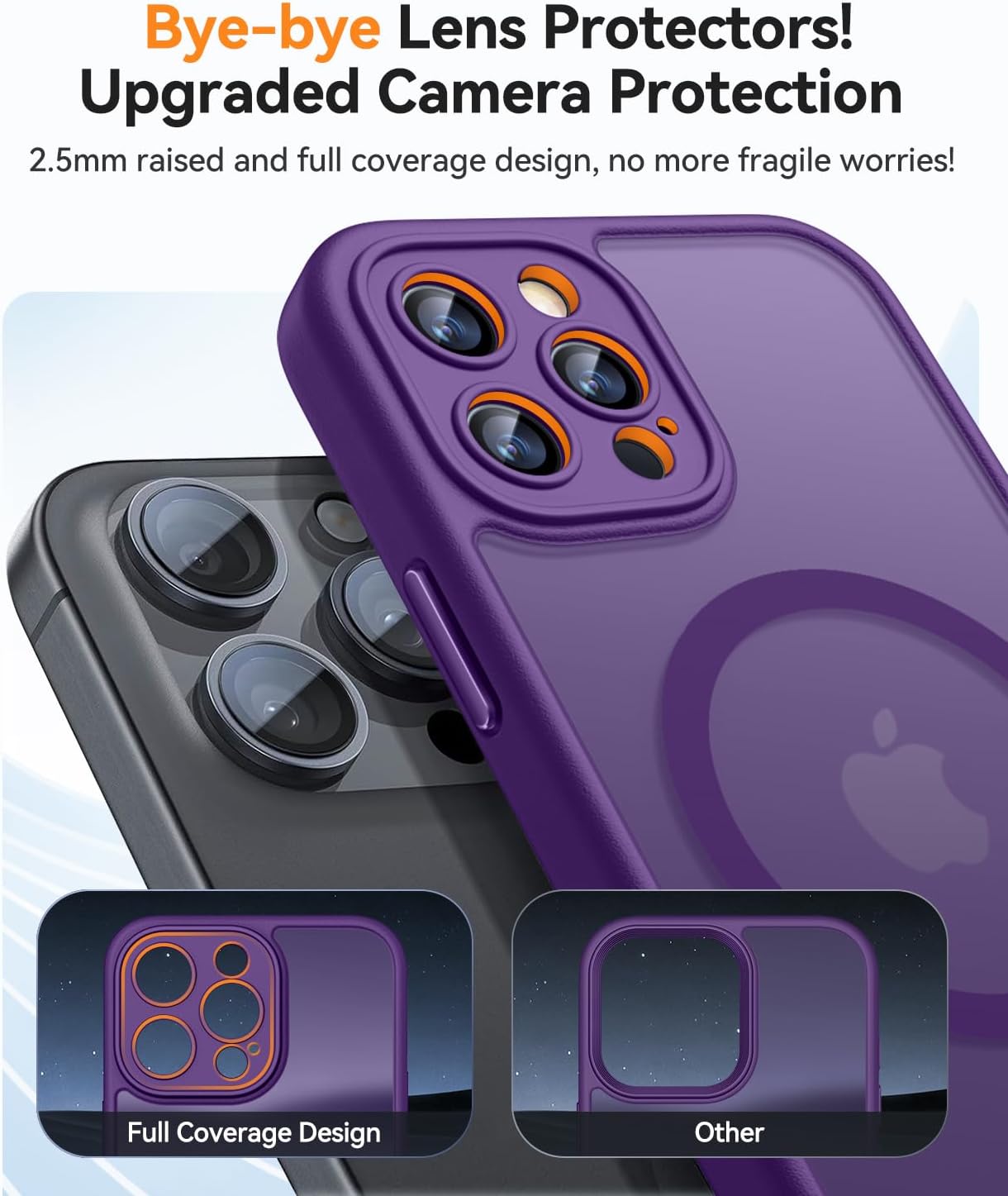 • Подобрена пълна защита на камерата: Кажете сбогом на конвенционалните протектори за обективи! В сравнение с други обикновени калъфи за телефони, нашият калъф за iPhone 15 предлага подобрена цялостна защита за камерата, с 2,5 мм висок ръб около обектива. Той осигурява цялостна защита за обектива, без да прави компромис с фотографията.