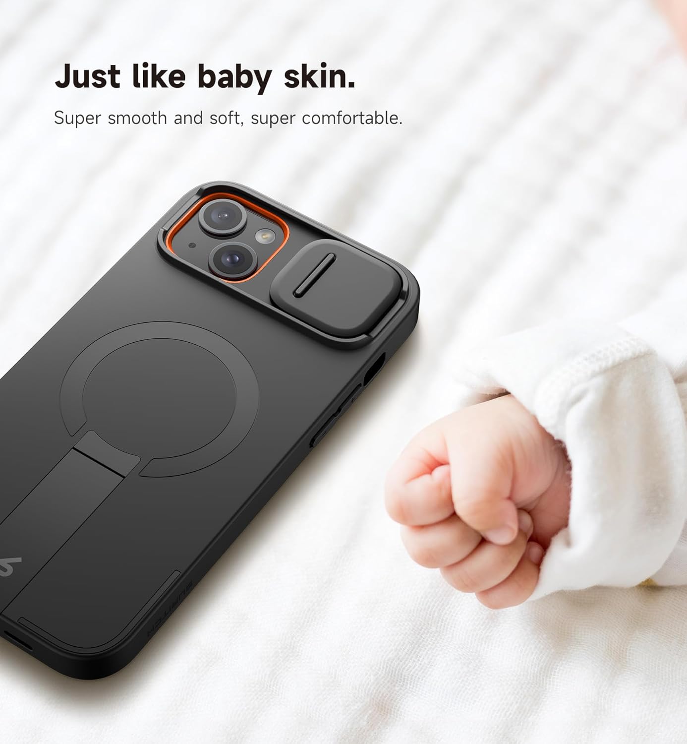 Магнитен калъф SURITCH, съвместим с iPhone 14 Plus/15 Plus, удароустойчив калъф за мобилен телефон, защитен калъф, устойчив на надраскване, с плъзгащ се капак за камерата и регулируема стойка (черен)