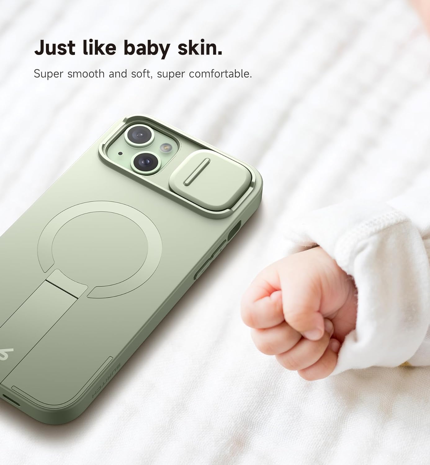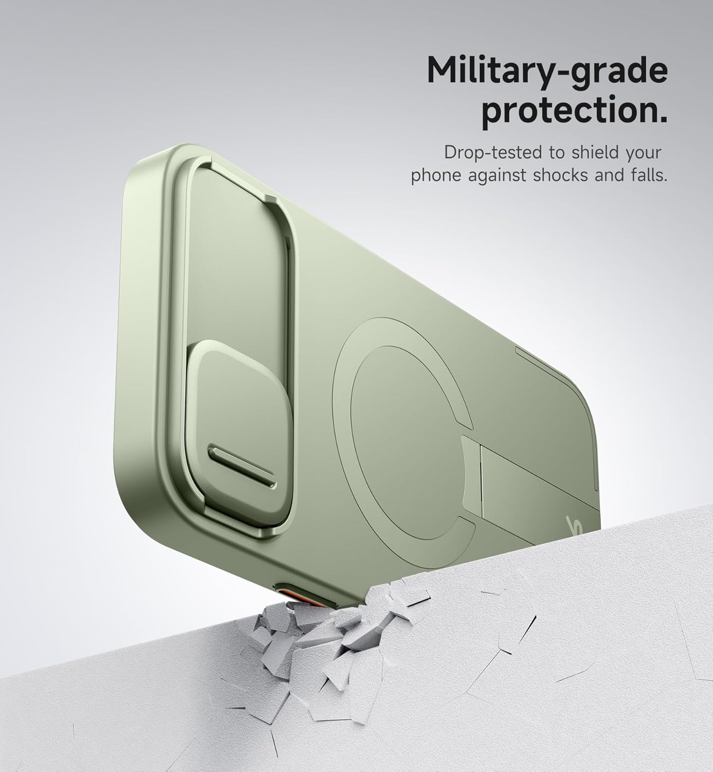 Магнитен калъф SURITCH, съвместим с iPhone 14 Plus/15 Plus, удароустойчив калъф за мобилен телефон, защитен калъф, устойчив на надраскване, с плъзгащ се капак за камерата и регулируема стойка (каки зелен)