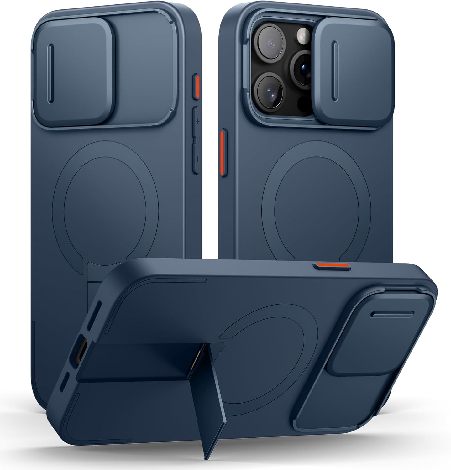 Магнитен калъф SURITCH, съвместим с iPhone 15 Pro Max, удароустойчив калъф за мобилен телефон, защитен калъф, устойчив на надраскване, с плъзгащ се капак за камерата и регулируема стойка (тъмносин)