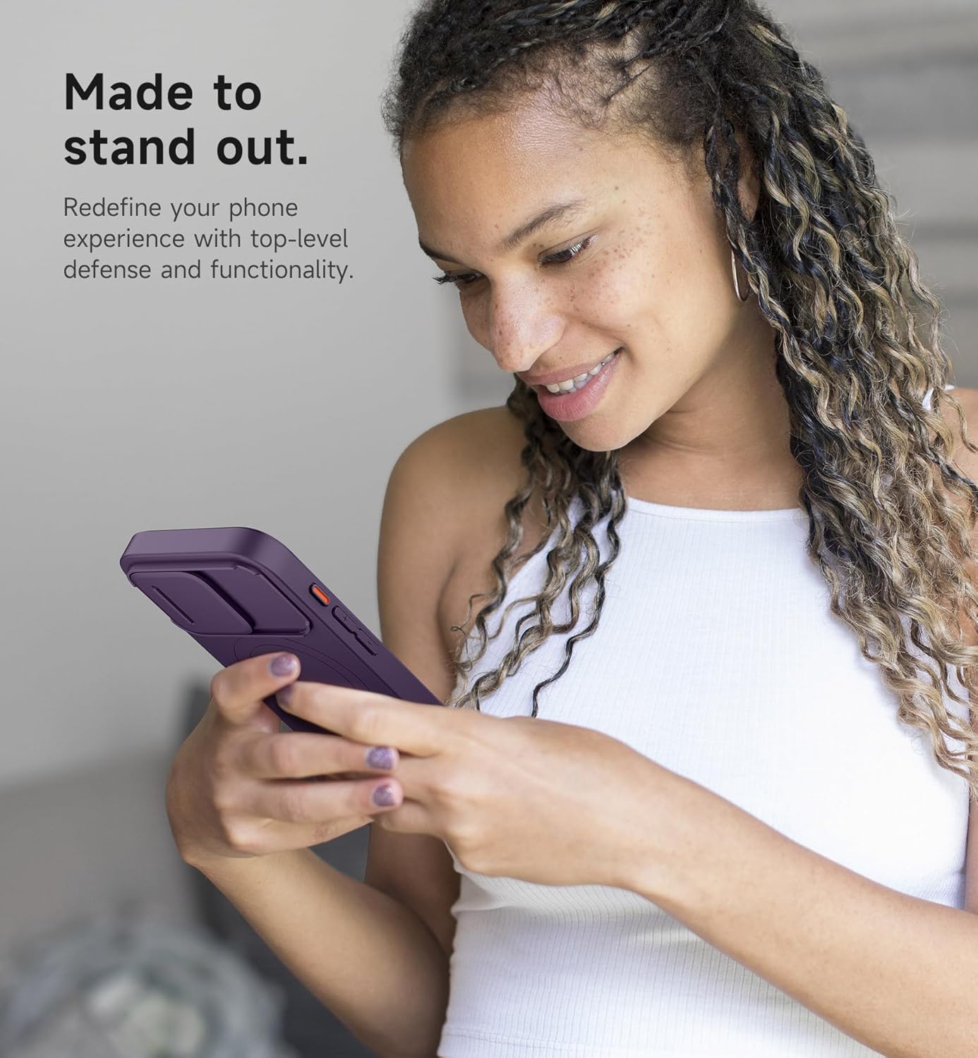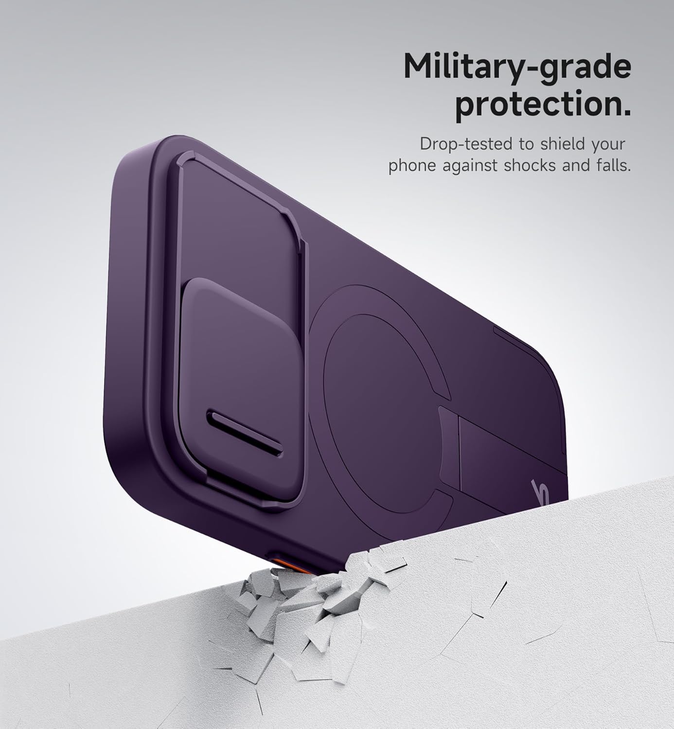 Магнитен калъф SURITCH, съвместим с iPhone 15 Pro, удароустойчив калъф за мобилен телефон, защитен калъф, устойчив на надраскване, с плъзгащ се капак за камерата и регулируема стойка (лилав)