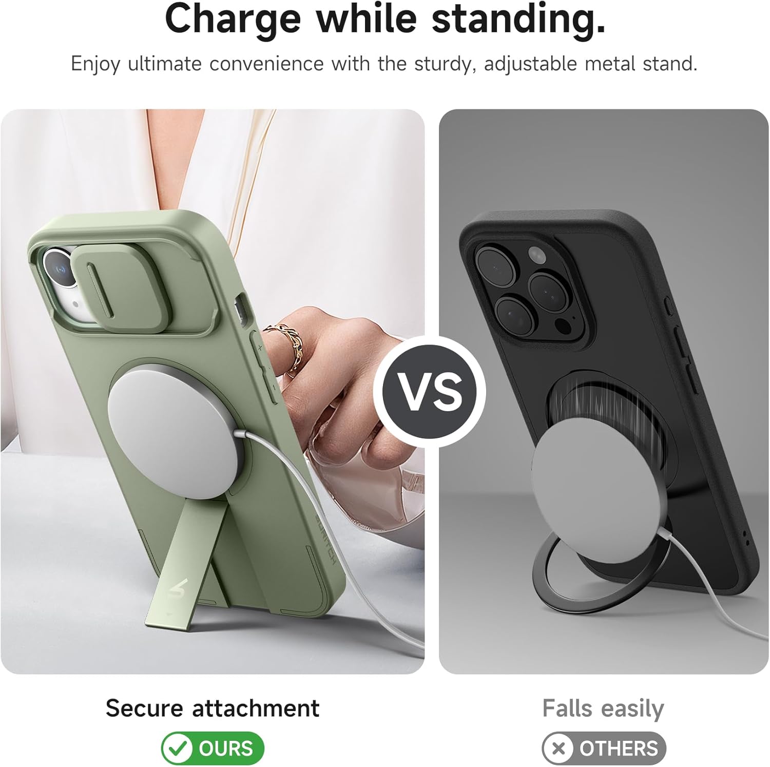 • Мощно магнитно закрепване: Този тънък калъф е с изключително силно магнитно закрепване (до 13,28 N), за да гарантира, че телефонът ви е здраво свързан с всички магнитни аксесоари, включително безжични зарядни устройства, държачи за превозни средства, захранване и др.