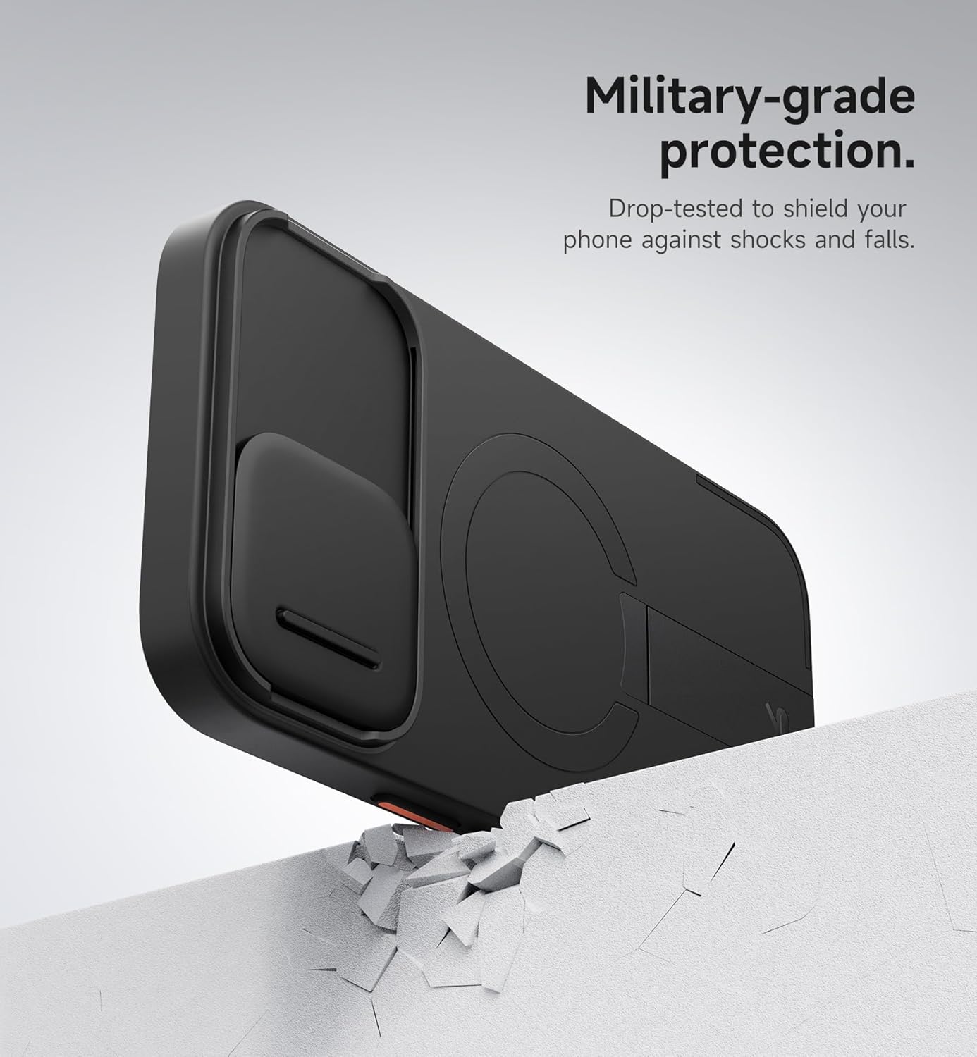 Магнитен калъф SURITCH, съвместим с iPhone 16 Plus, удароустойчив калъф за мобилен телефон, защитен калъф, устойчив на надраскване, с плъзгащ се капак за камерата и регулируема стойка (черен)