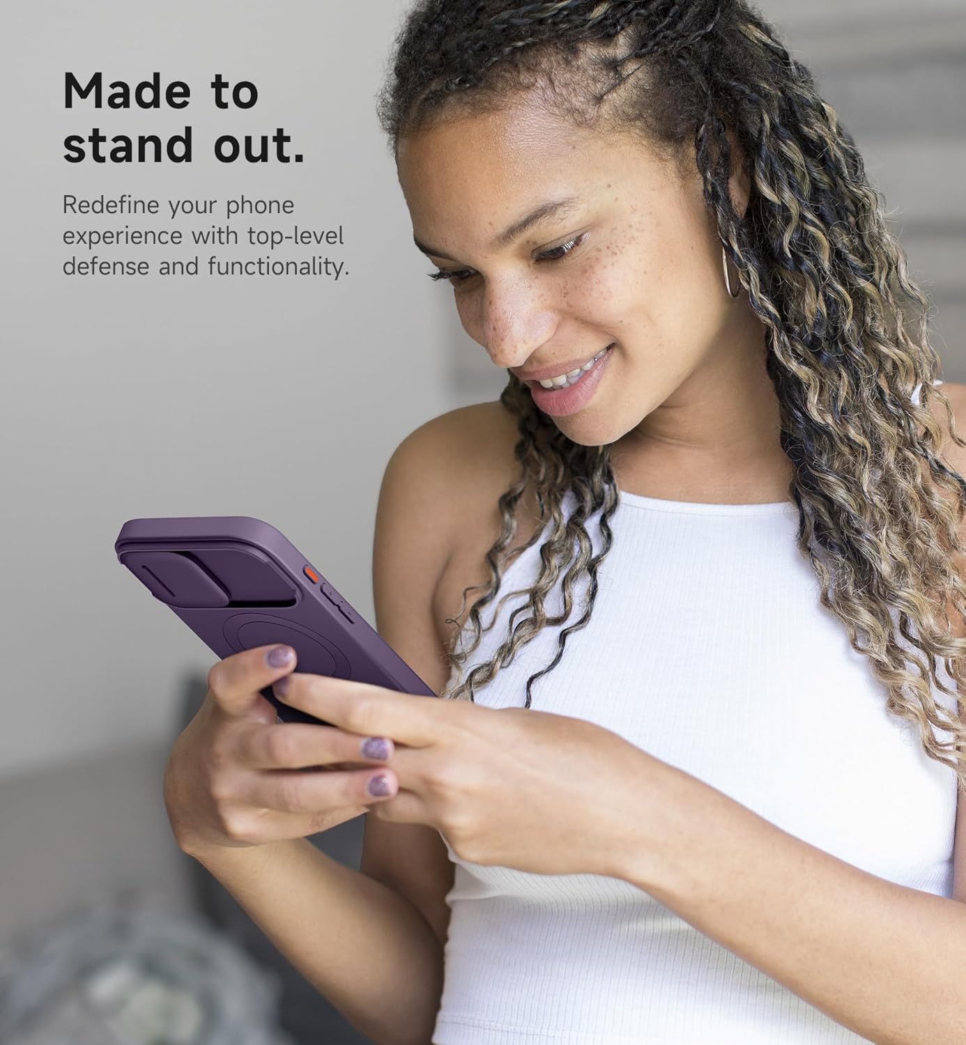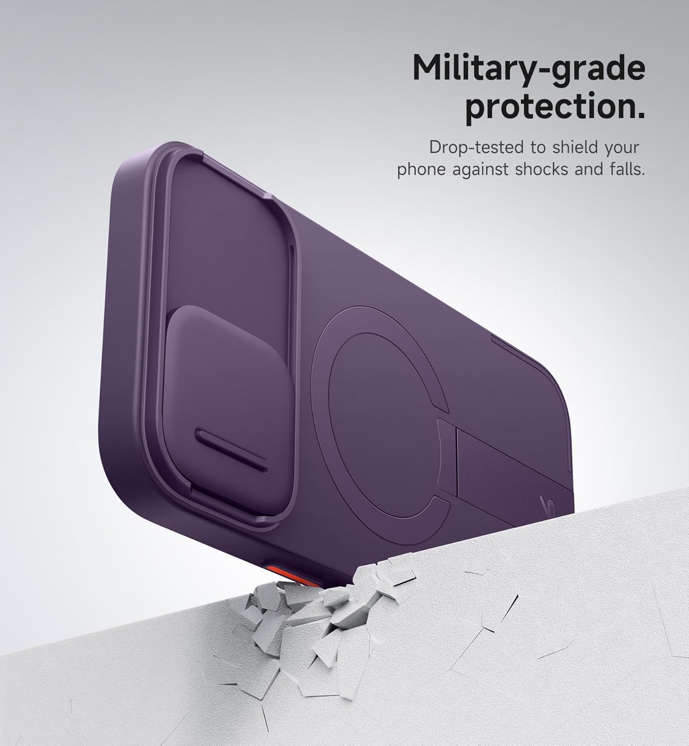 Магнитен калъф SURITCH, съвместим с iPhone 16 Plus, удароустойчив калъф за мобилен телефон, защитен калъф, устойчив на надраскване, с плъзгащ се капак за камерата и регулируема стойка (лилав)