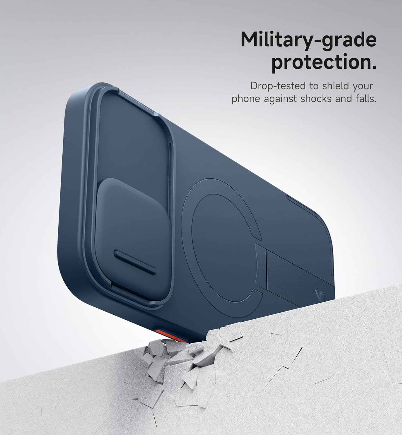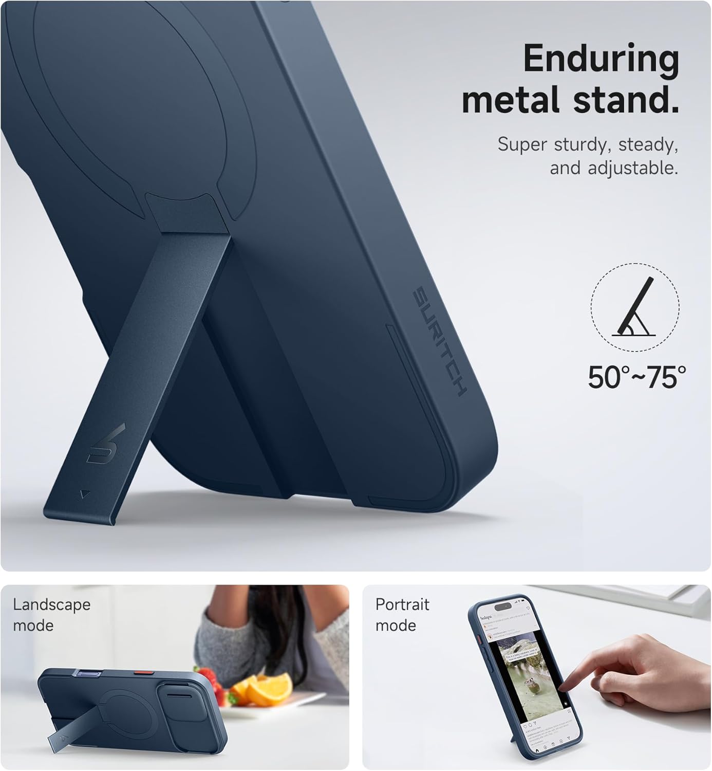 Магнитен калъф SURITCH, съвместим с iPhone 16 Plus, удароустойчив калъф за мобилен телефон, защитен калъф, устойчив на надраскване, с плъзгащ се капак за камерата и регулируема стойка (тъмносин)