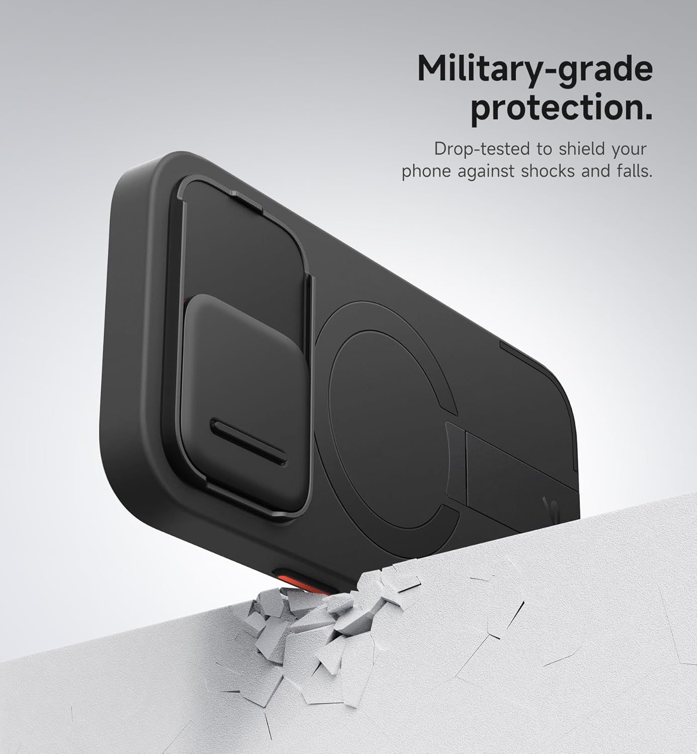 Магнитен калъф SURITCH, съвместим с iPhone 16 Pro, удароустойчив калъф за мобилен телефон, защитен калъф, устойчив на надраскване, с плъзгащ се капак за камерата и регулируема стойка (черен)