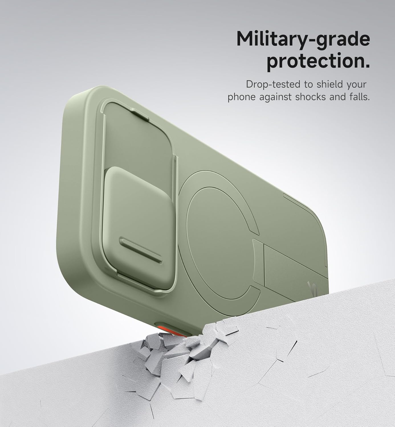 Магнитен калъф SURITCH, съвместим с iPhone 16 Pro, удароустойчив калъф за мобилен телефон, защитен калъф, устойчив на надраскване, с плъзгащ се капак за камерата и регулируема стойка (каки зелен)
