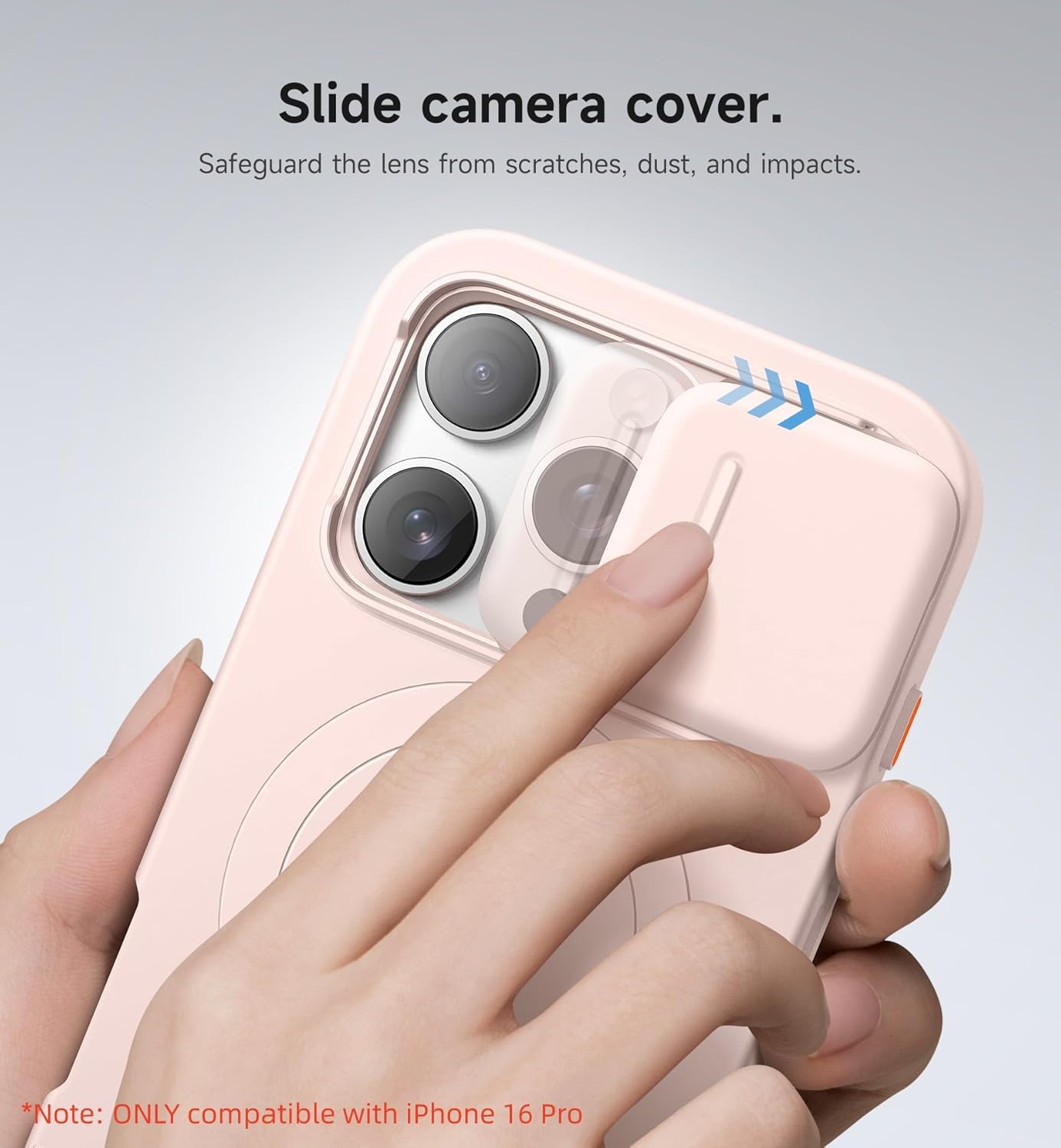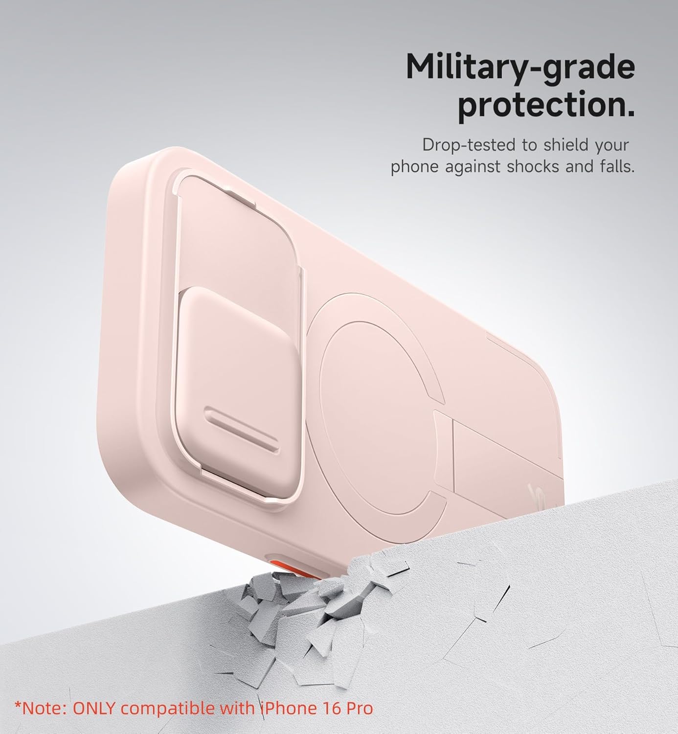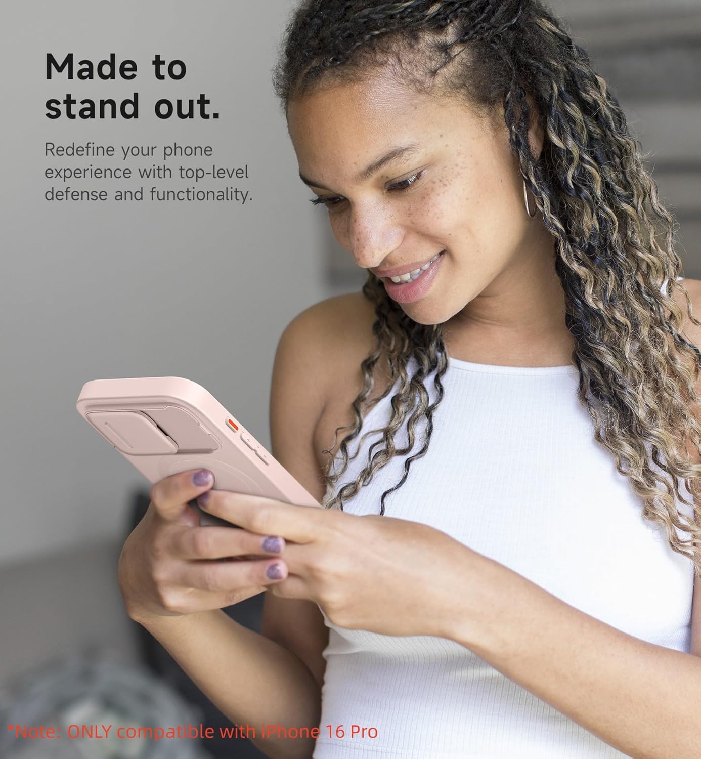 Магнитен калъф SURITCH, съвместим с iPhone 16 Pro, удароустойчив калъф за мобилен телефон, защитен калъф, устойчив на надраскване, с плъзгащ се капак за камерата и регулируема стойка (розов)