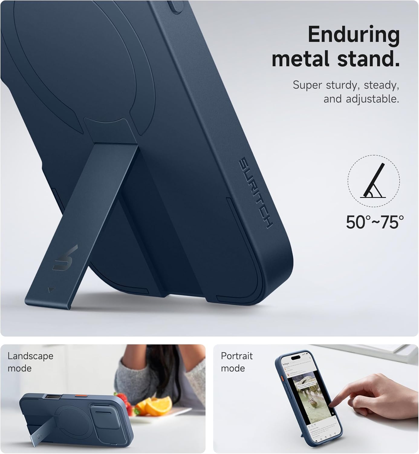 Магнитен калъф SURITCH, съвместим с iPhone 16 Pro, удароустойчив калъф за мобилен телефон, защитен калъф, устойчив на надраскване, с плъзгащ се капак за камерата и регулируема стойка (тъмносин)