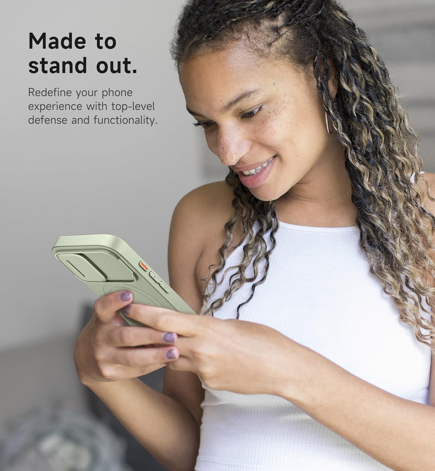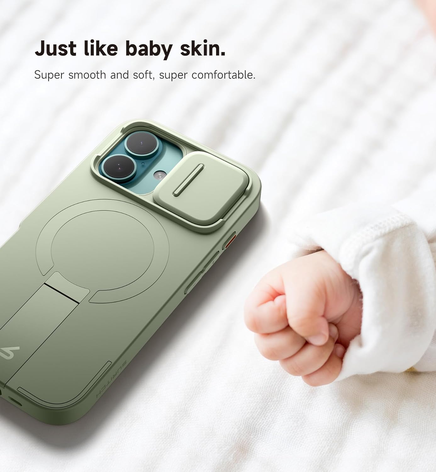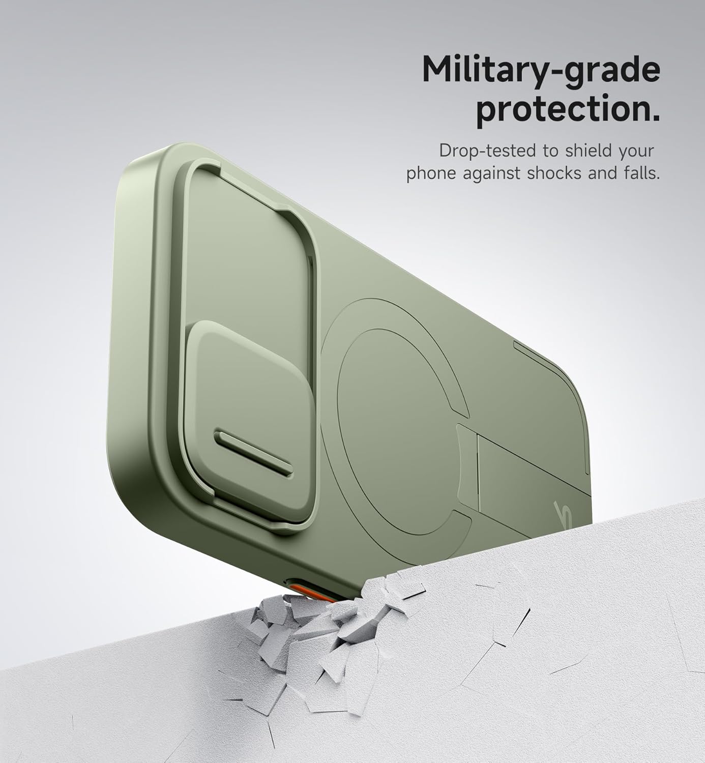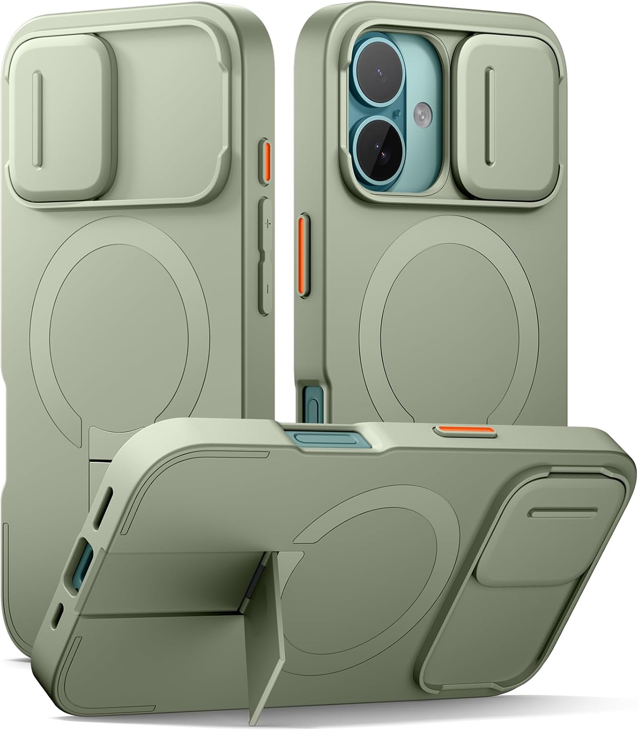 Магнитен калъф SURITCH, съвместим с iPhone 16, удароустойчив калъф за мобилен телефон, защитен калъф, устойчив на надраскване, с плъзгащ се капак за камерата и регулируема стойка (каки зелен)