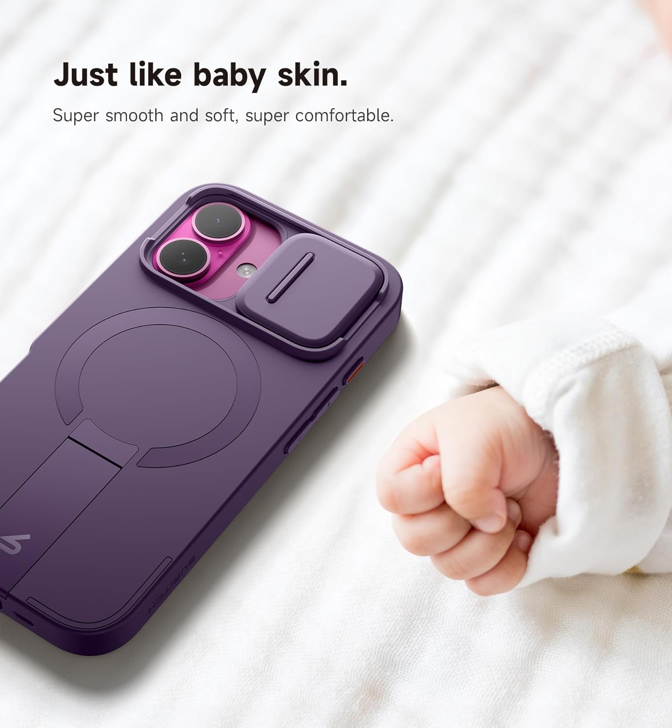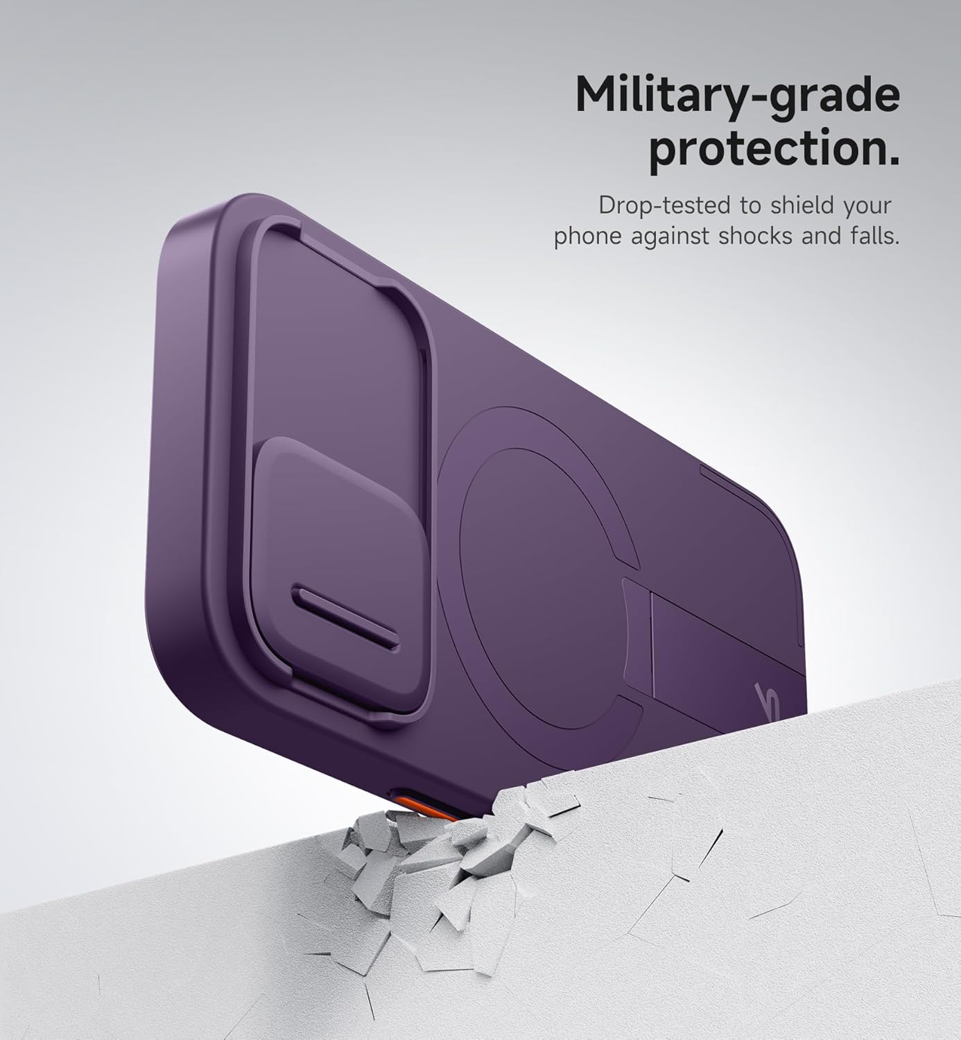 Магнитен калъф SURITCH, съвместим с iPhone 16, удароустойчив калъф за мобилен телефон, защитен калъф, устойчив на надраскване, с плъзгащ се капак за камерата и регулируема стойка (лилав)