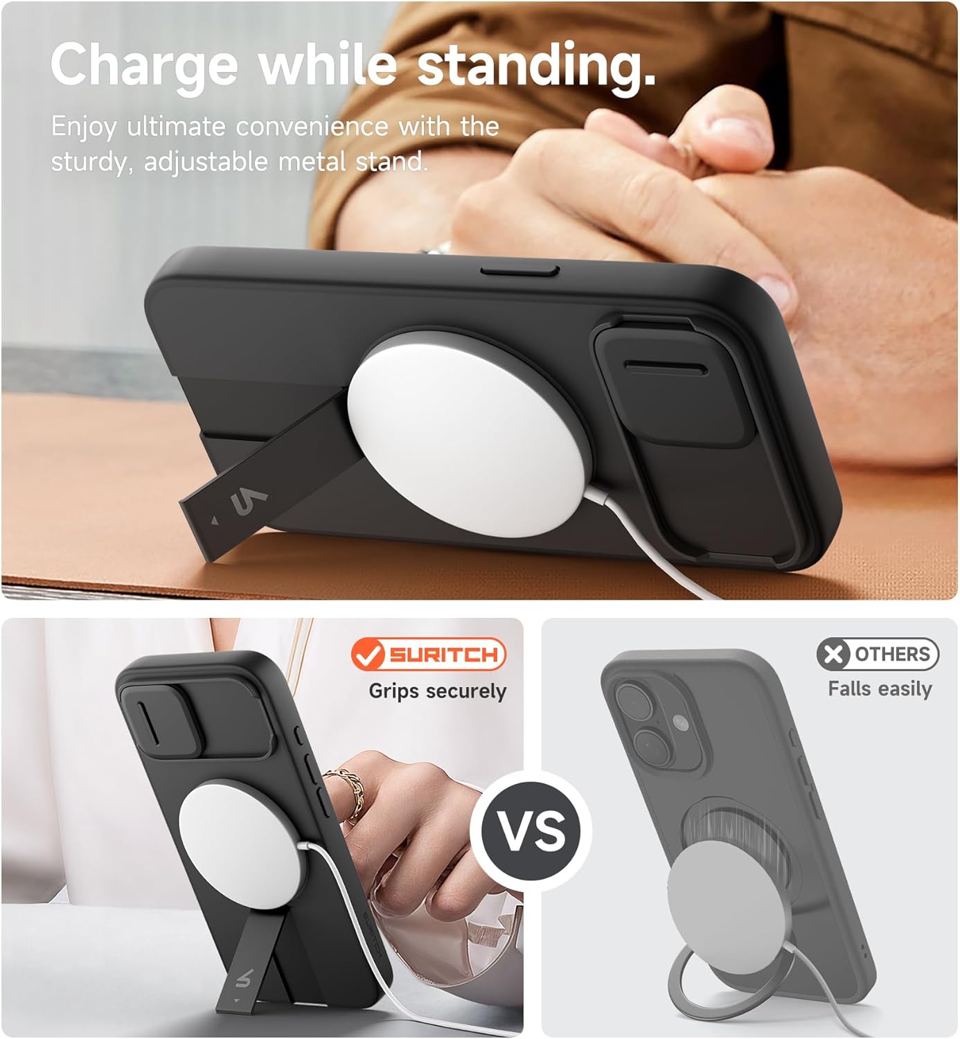 Магнитен калъф SURITCH, съвместим с iPhone 16e, удароустойчив калъф за мобилен телефон, защитен калъф, устойчив на надраскване, с плъзгащ се капак на камерата и регулируема стойка (черен)