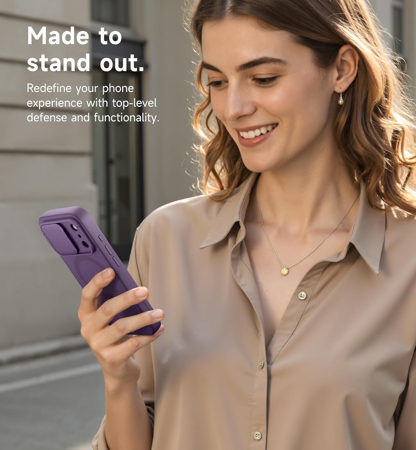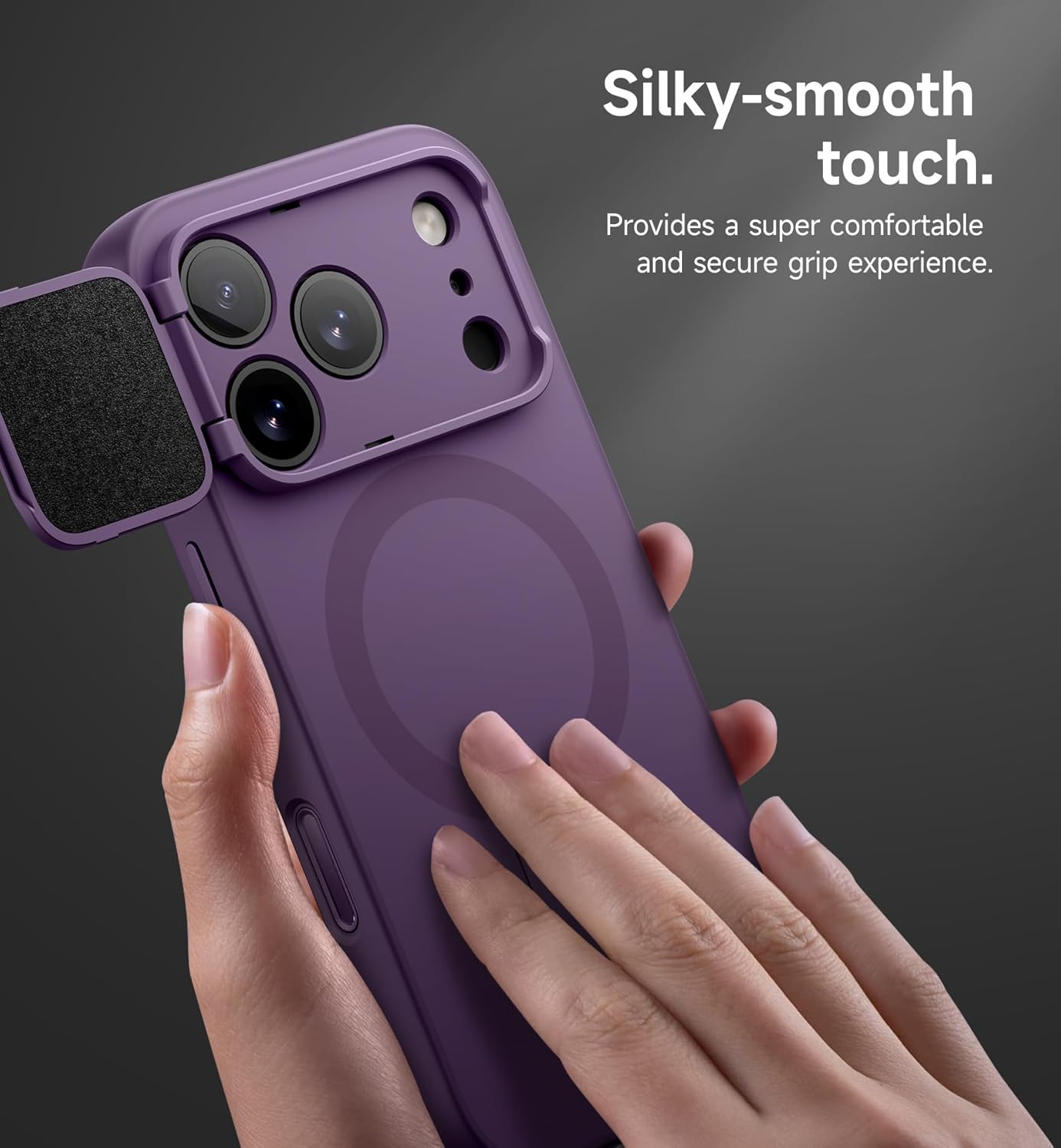 Магнитен калъф SURITCH, съвместим с iPhone 17 Pro Max, удароустойчив калъф за мобилен телефон, защитен калъф, устойчив на надраскване, с бутон за управление на камерата, капак за камерата и регулируема стойка (лилав)