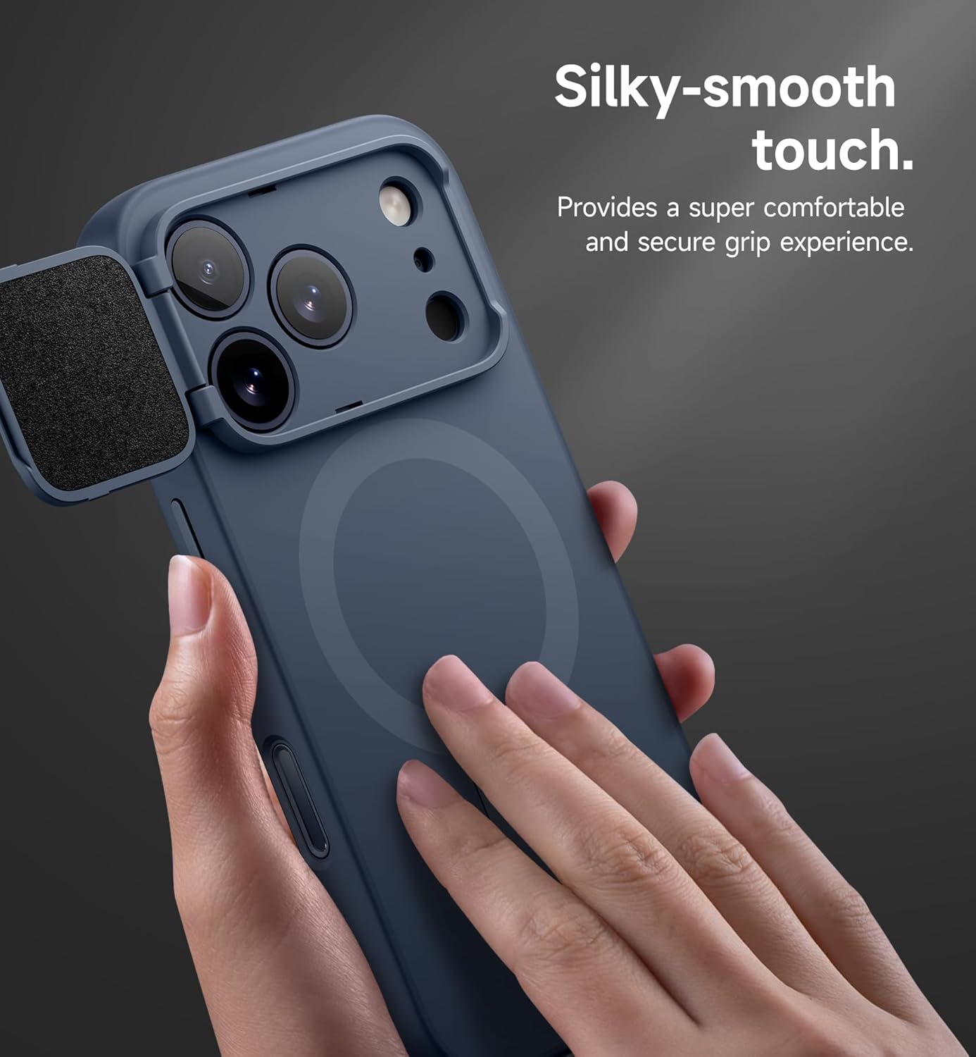 Магнитен калъф SURITCH, съвместим с iPhone 17 Pro Max, удароустойчив калъф за мобилен телефон, защитен калъф, устойчив на надраскване, с бутон за управление на камерата, капак за камерата и регулируема стойка (тъмносин)