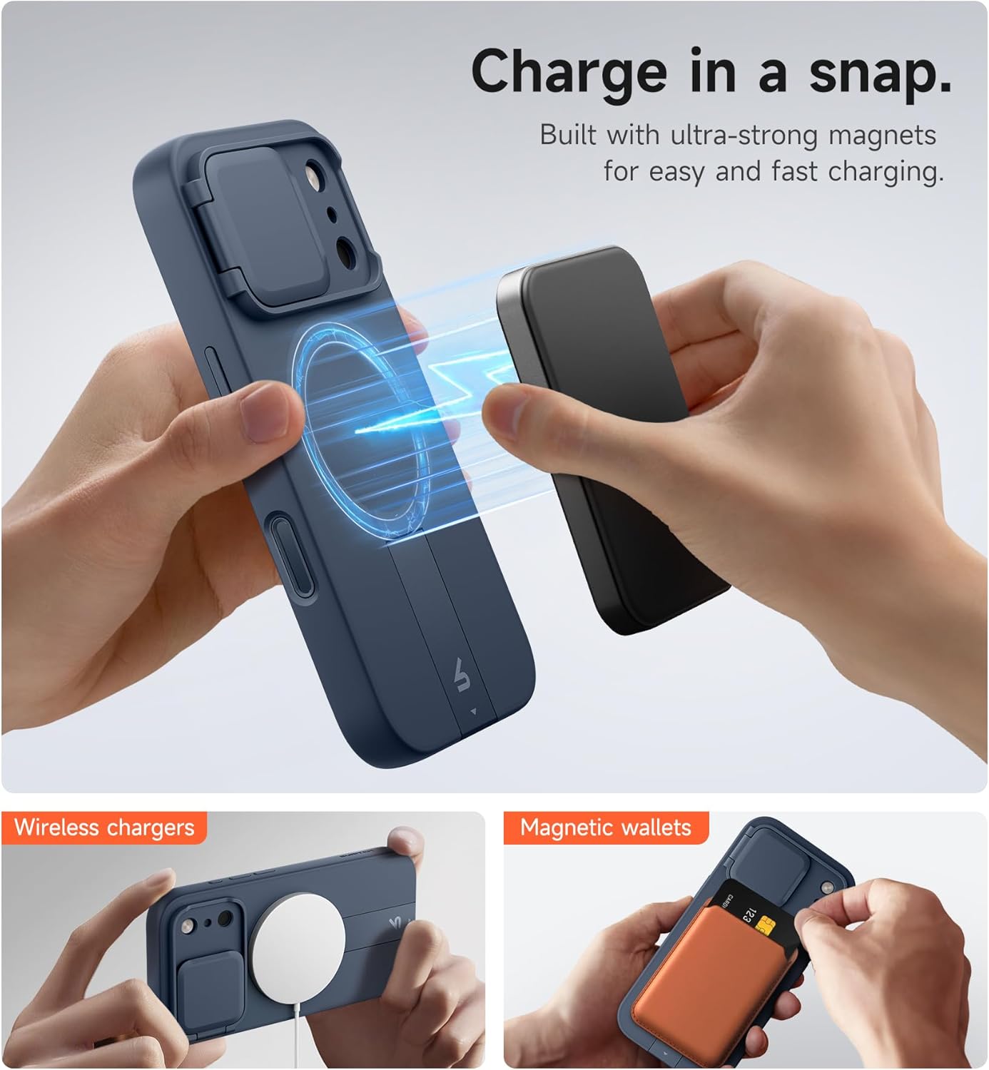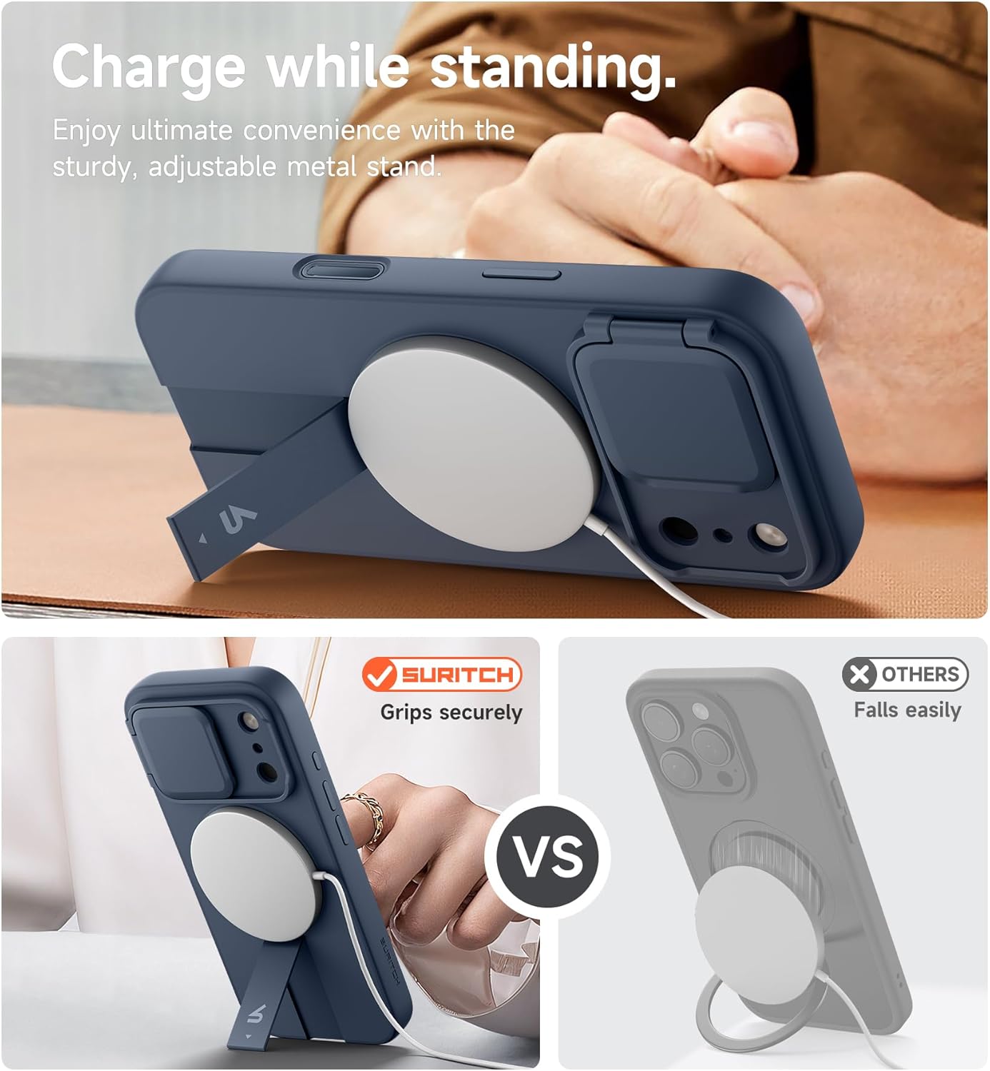 Магнитен калъф SURITCH, съвместим с iPhone 17 Pro, удароустойчив калъф за мобилен телефон, защитен калъф, устойчив на надраскване, с бутон за управление на камерата, капак за камерата и регулируема стойка (тъмносин)