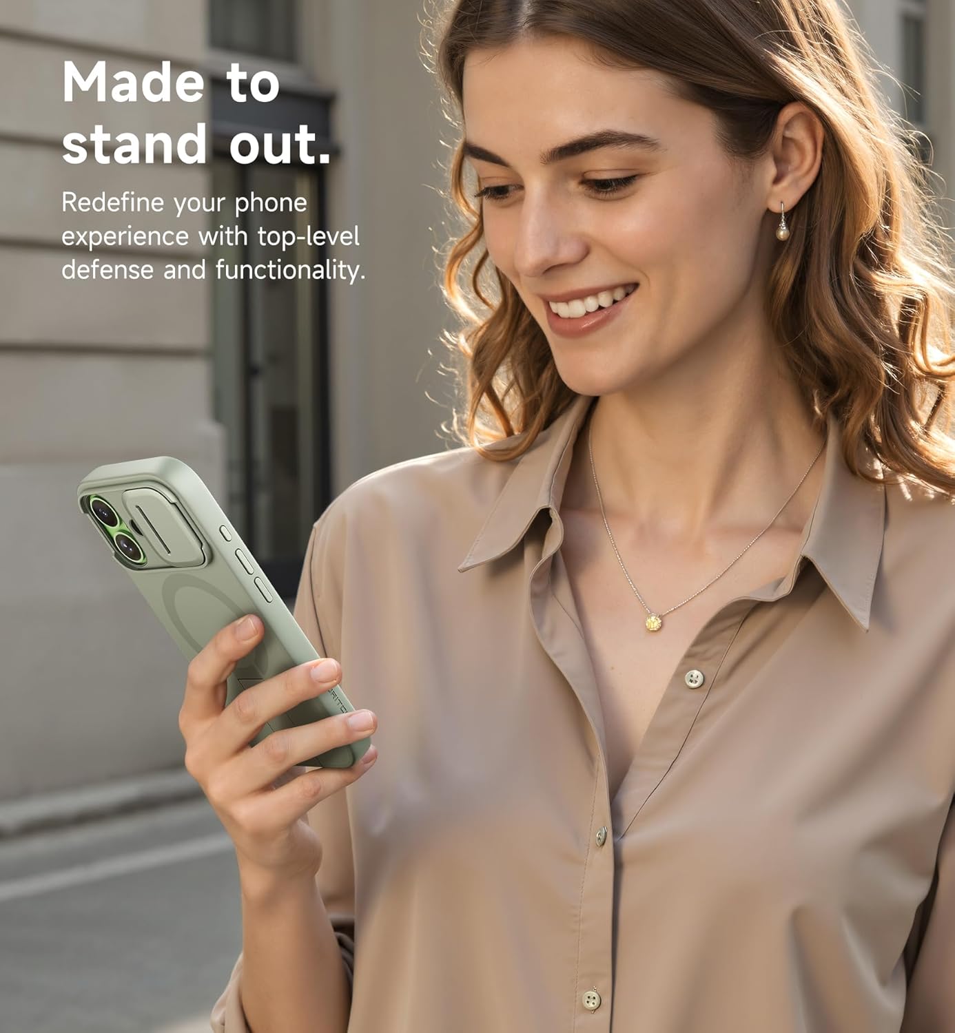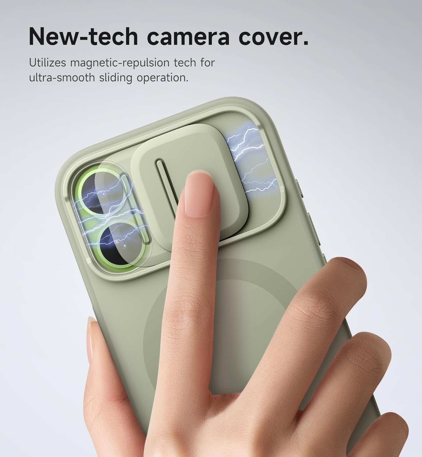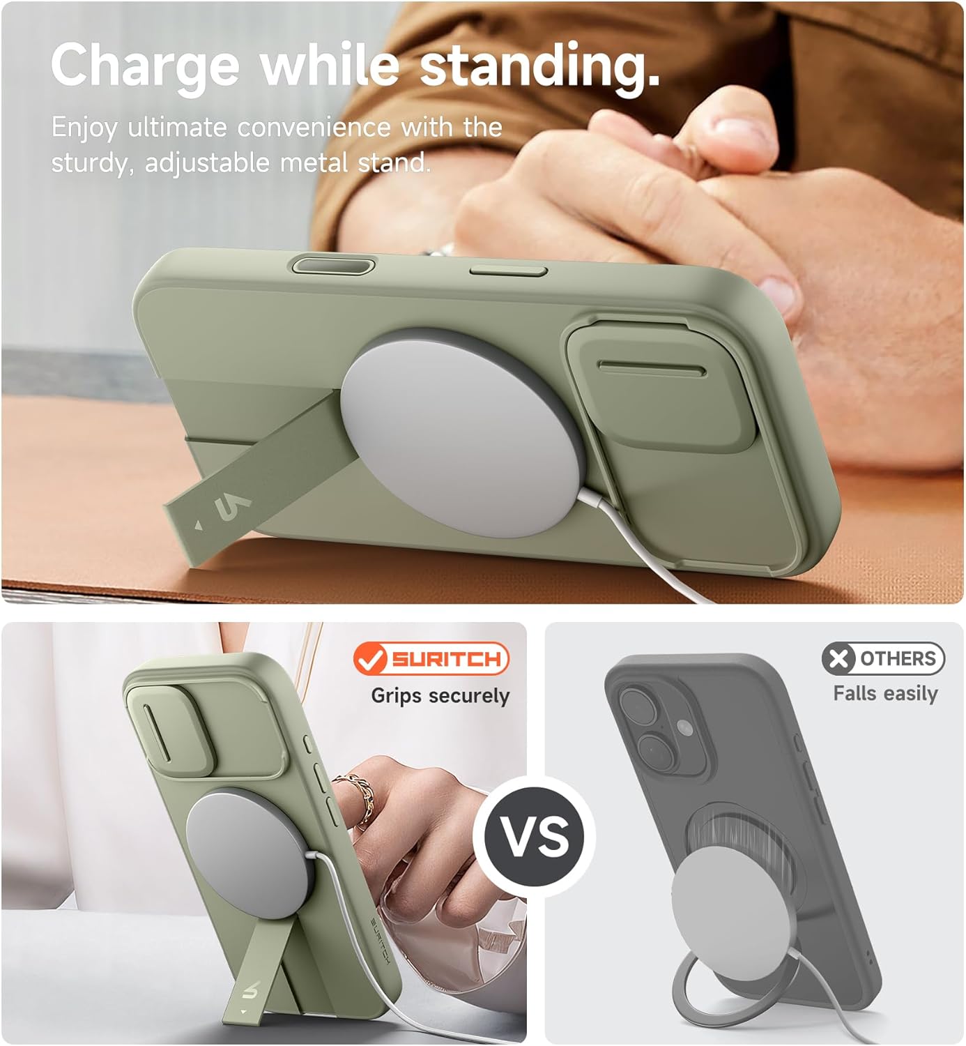 Магнитен калъф SURITCH, съвместим с iPhone 17, удароустойчив калъф за мобилен телефон, защитен калъф, устойчив на надраскване, с бутон за управление на камерата, плъзгащ се капак на камерата и регулируема стойка (каки зелено)